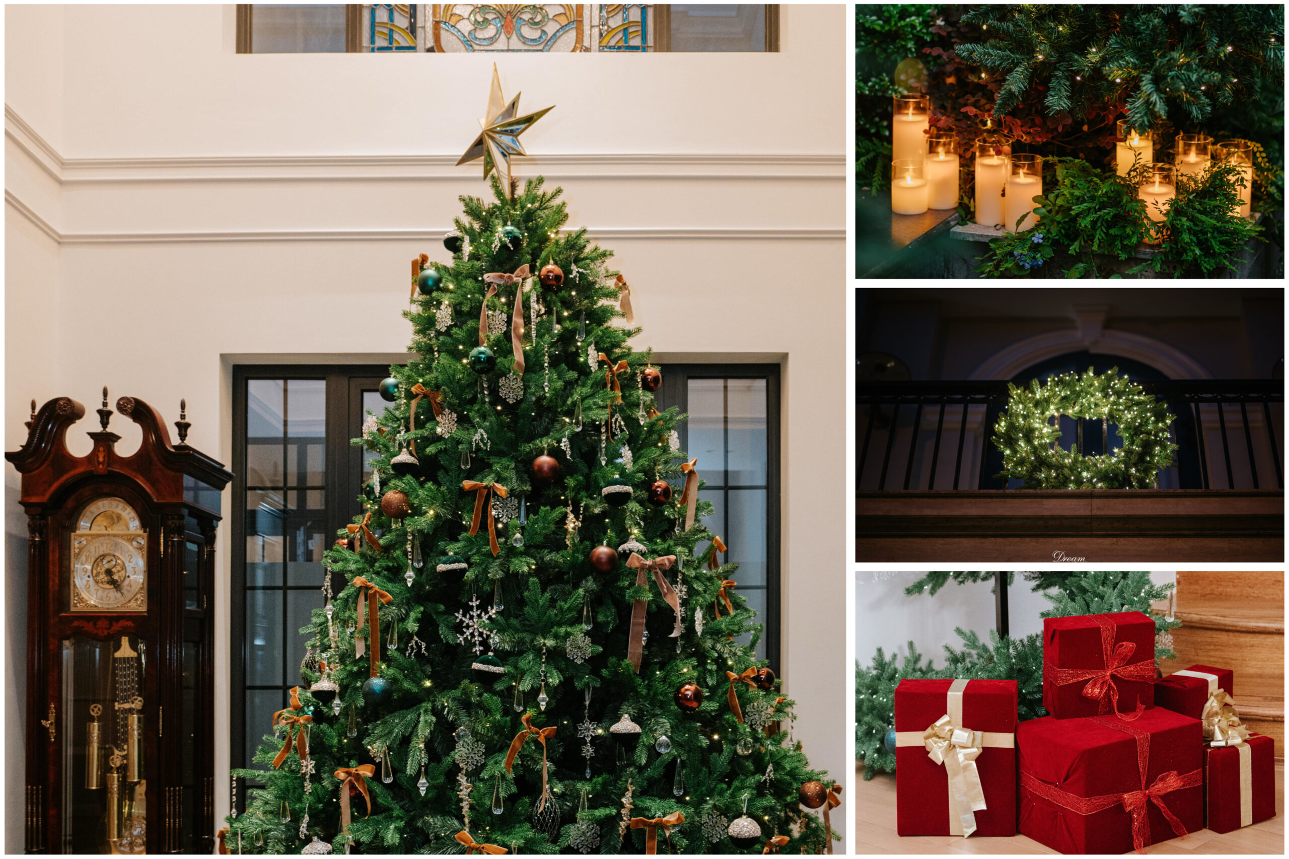 Lối vào là phần quan trọng nhất để bắt đầu mạch cảm xúc. Khi vừa bước đến cửa, trước mặt là hai tán thông lớn dựng hai bên, lấp lánh bởi hiệu ứng đèn và những hàng nến đặt dưới chân, khiến vị khách nào vừa bước đến cũng có cảm giác như đang mở cửa bước vào đêm Noel thực thụ: lung linh, ấm cúng và đầy hứa hẹn. Các khu vực còn lại của ngôi nhà tiếp tục được phủ lên bởi những gam màu khác nhau, đan xen tạo nên một tổng thể đồng điệu và dịu dàng. Mỗi góc nhỏ, dù là sảnh, bàn tiệc hay bậc thềm, đều trở thành điểm dừng chân để mọi người ngắm nghía và cảm nhận sự rộn ràng của mùa cuối năm.
