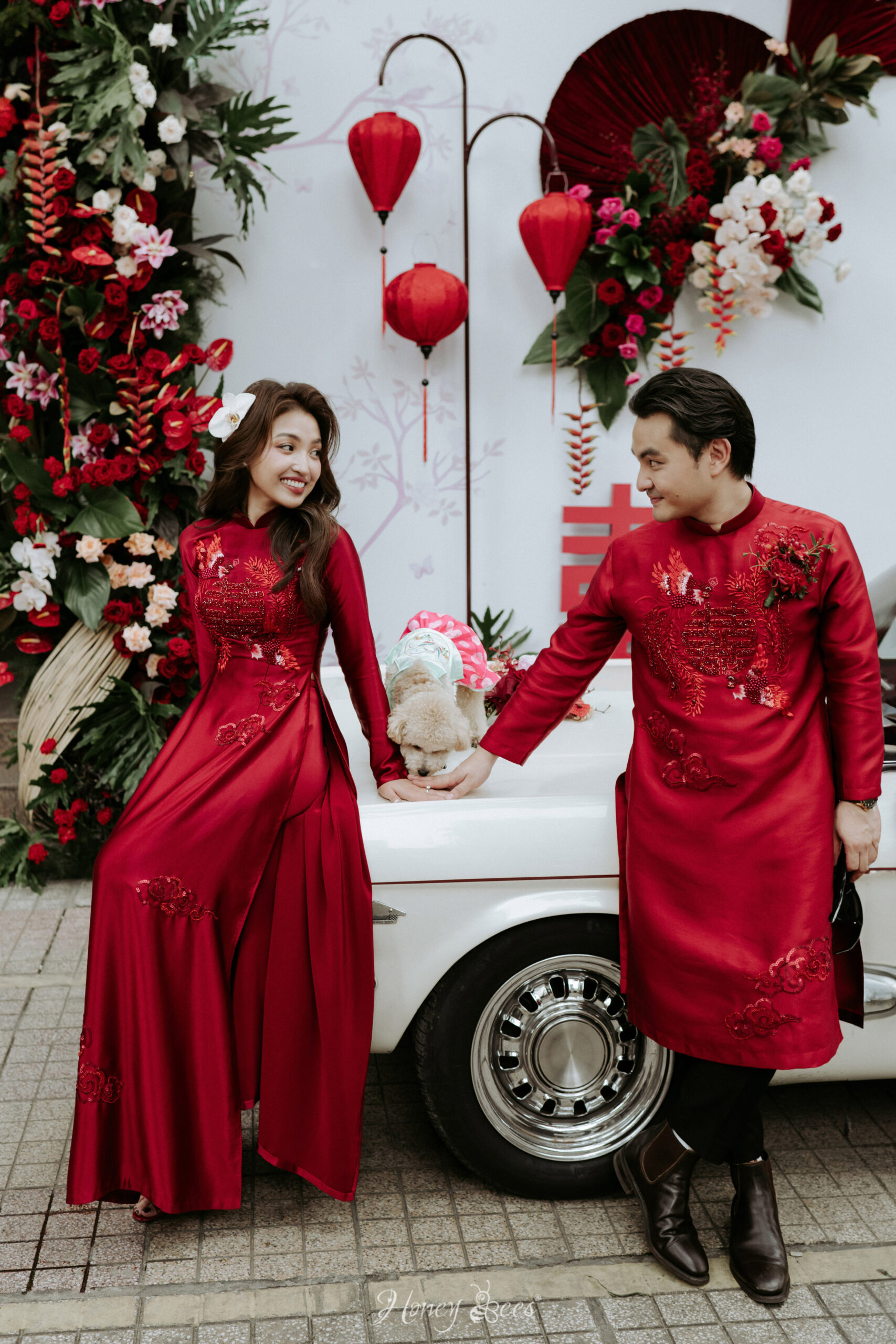 Đưa hai gam màu đối lập vào cùng một concept là thử thách không nhỏ. Nhưng đội ngũ HONEY BEES lại yêu chính cái khó đó. Mỗi cành hoa, tấm vải, chiếc nơ đều được sắp đặt cẩn thận để không gian vừa có chất hiện đại, vừa vẫn giữ hơi thở tình cảm.