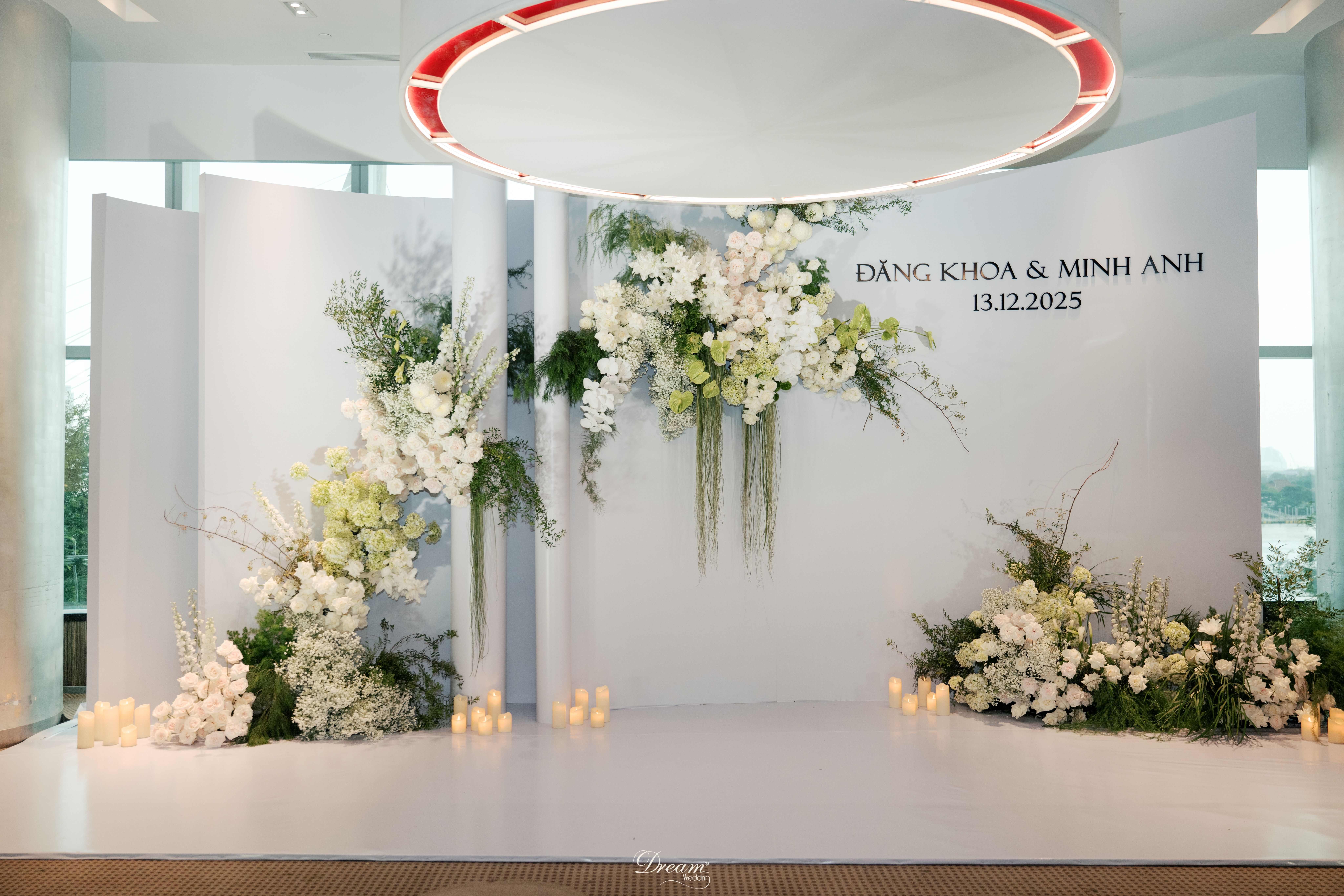Bước vào không gian lễ cưới của Minh Anh & Đăng Khoa, cảm giác đầu tiên không phải là sự choáng ngợp, mà là sự an yên. Sắc trắng tinh khôi hòa cùng sắc xanh lá dịu mát tạo nên một tổng thể hài hòa, gần gũi với thiên nhiên và đầy hơi thở tươi mới.