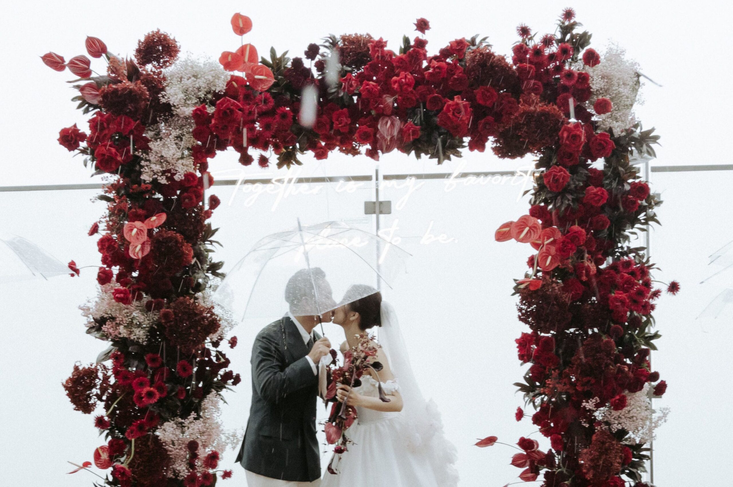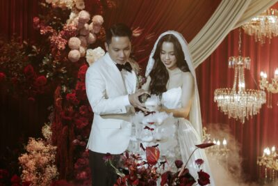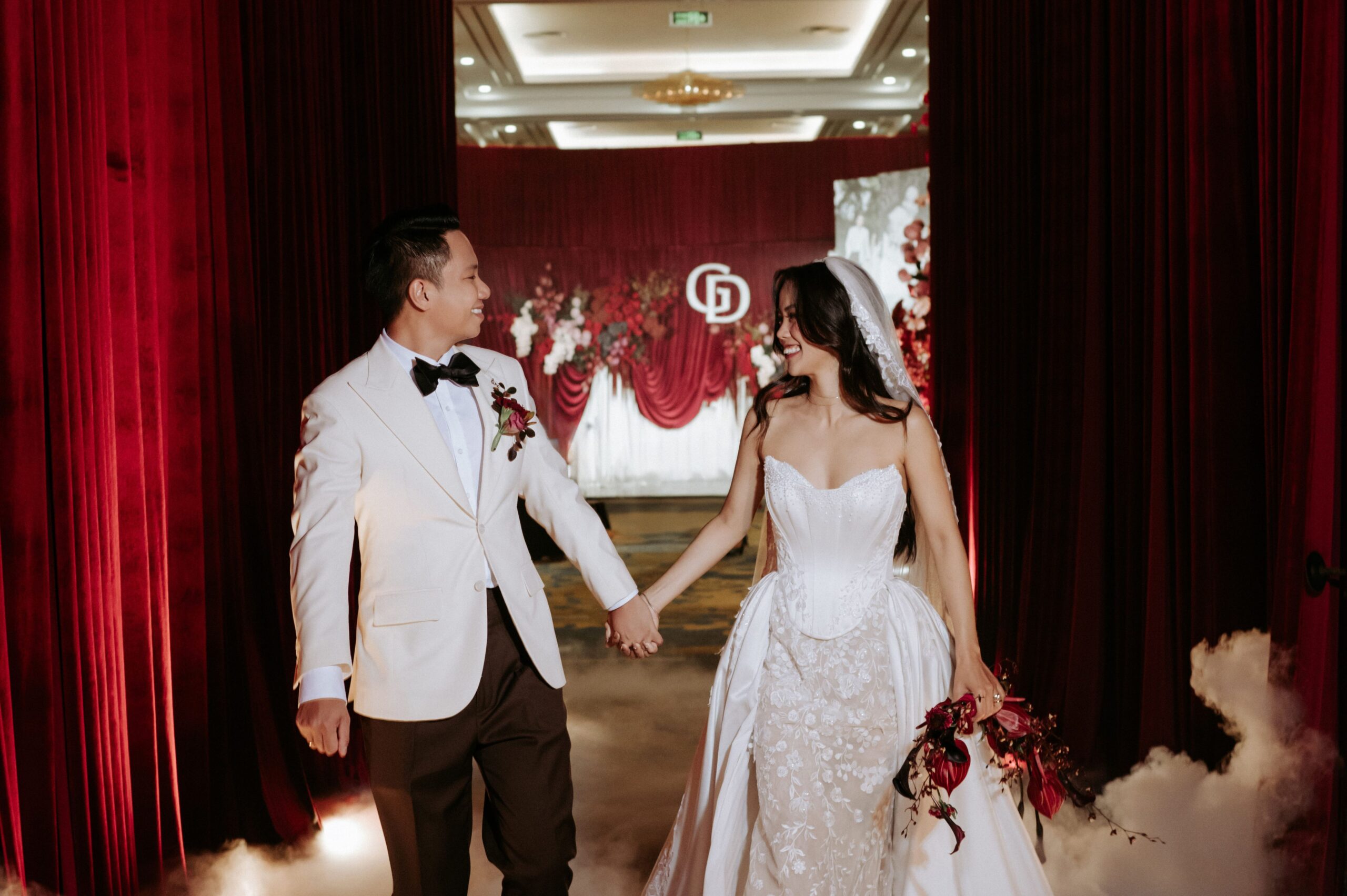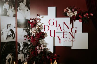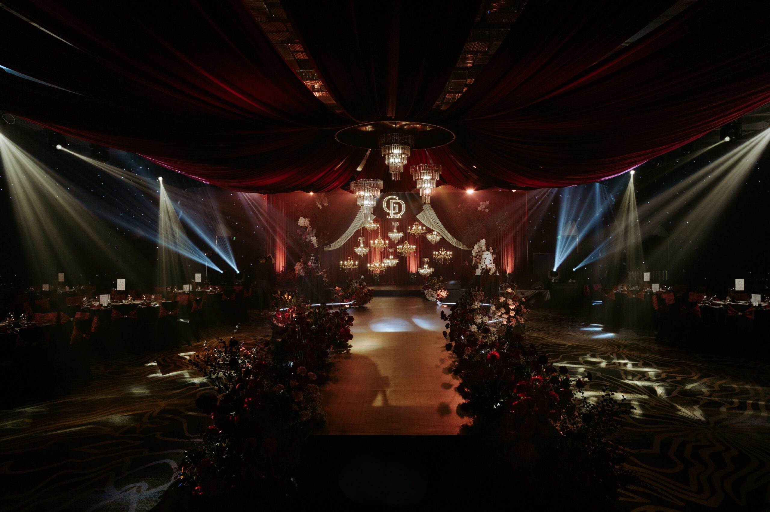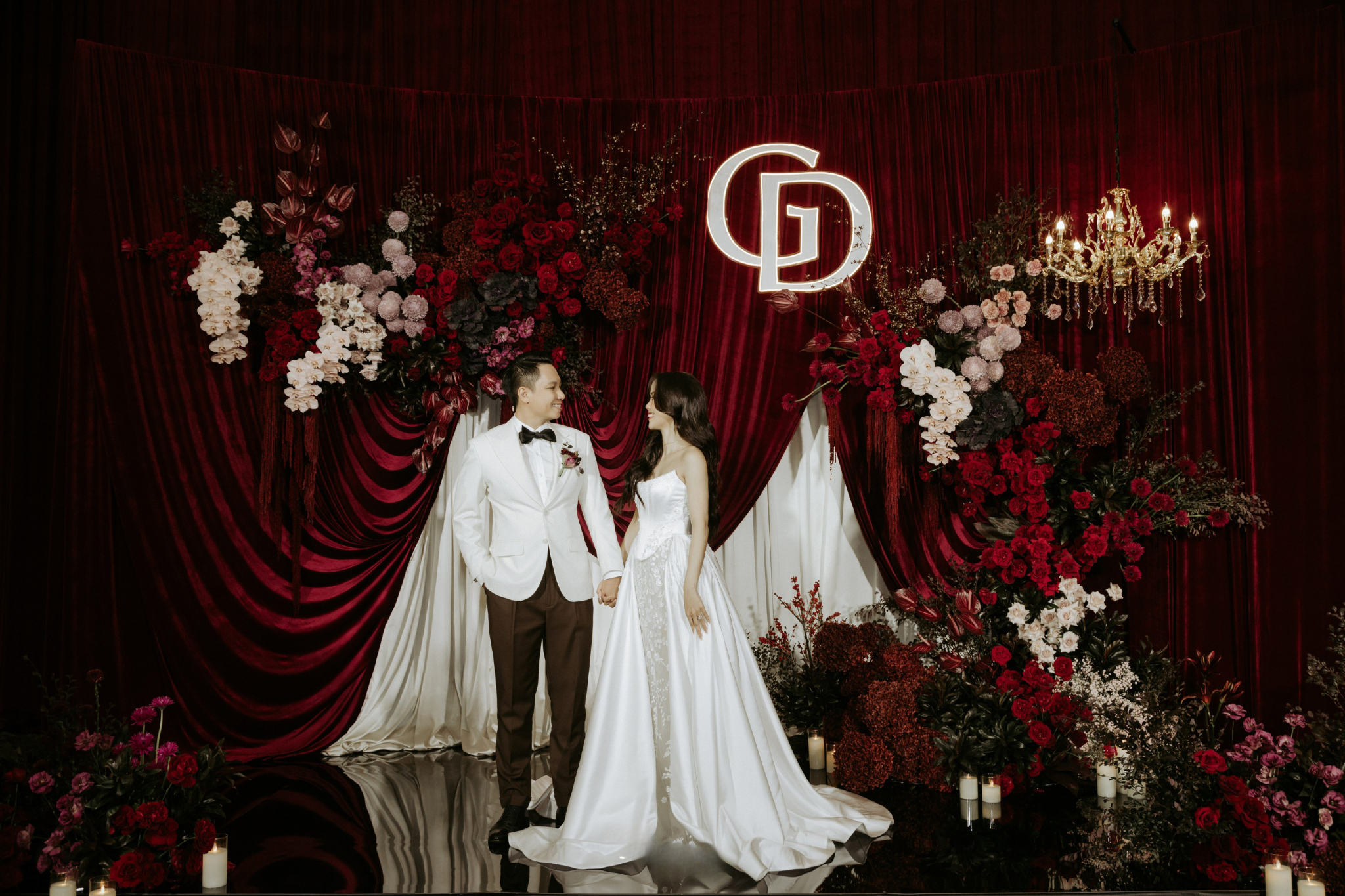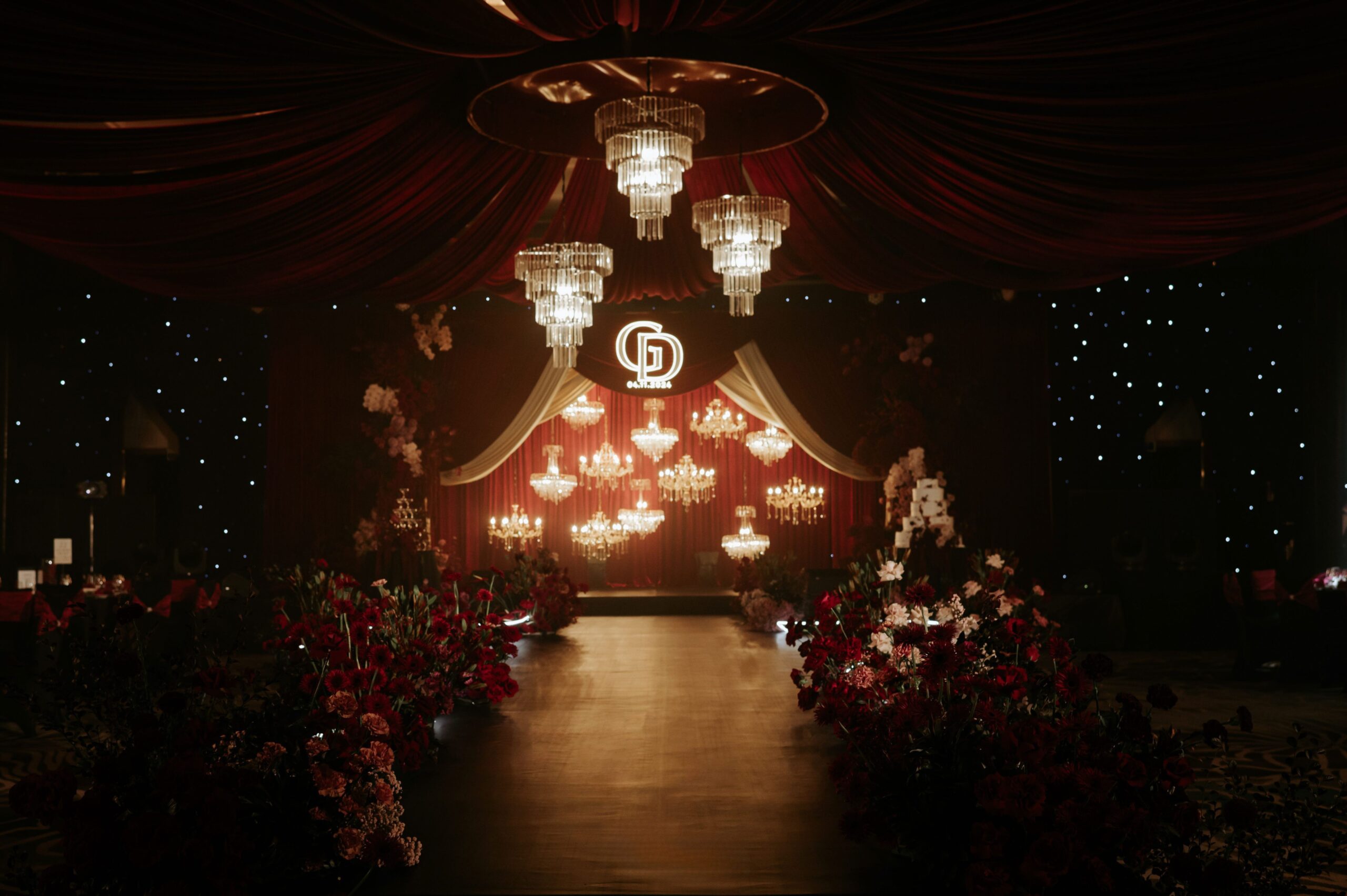 Concept đám cưới sắc đỏ “Golden Hour” tựa như một buổi tiệc dạ vũ hoàng gia, chúc mừng cho ngày Giang và Duyên bước sang chương mới của tình yêu, nơi cả hai cùng nhau vun vén tổ ấm. Sắc đỏ Burgundy bao trùm hoàn toàn không gian khiến tiệc cưới trở nên xa hoa, lộng lẫy. Gam màu đỏ toát lên khí chất sang trọng, huyền bí, tuy là tone đỏ trầm nhưng lại rực rỡ một cách đặc biệt mang theo chút dư vị đậm đà, ngọt ngào của tình yêu. Để dẫn dắt cảm xúc của các khách quan hòa vào không khí của đêm vũ hội, concept đám cưới sắc đỏ “Golden Hour” đã sử dụng ánh sáng của những khối đèn chùm kiểu cổ, cộng hưởng với chất liệu bóng mướt từ những dải lụa khiến khung cảnh trở nên lung linh hơn bao giờ hết, một sân khấu lớn đang chờ đợi Giang và Duyên nắm tay nhau hoàn thành điệu khiêu vũ đầu tiên để bày tỏ niềm vui ngày trọng đại.
