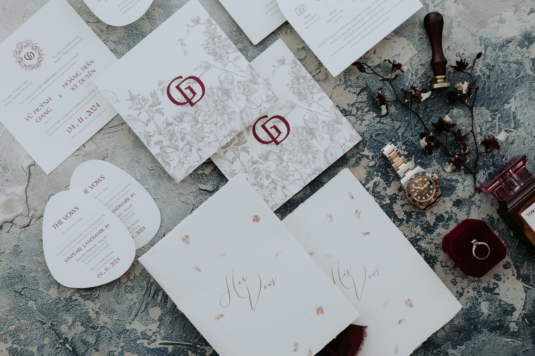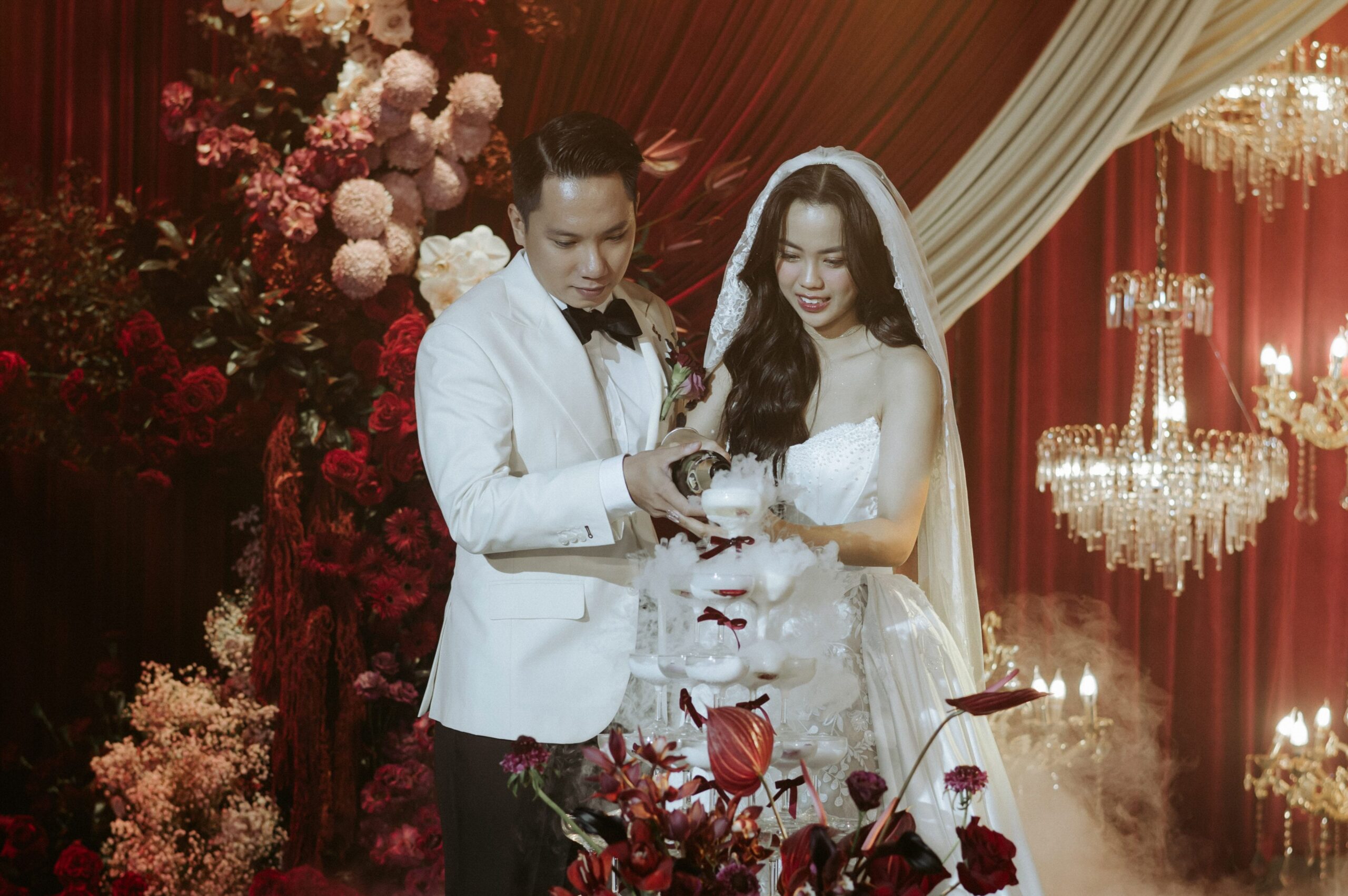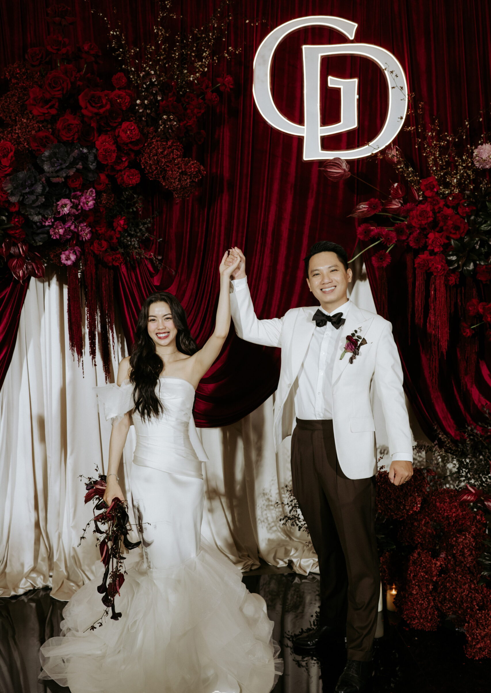 - Sắc đỏ Burgundy: Không chỉ mang đến sự lộng lẫy, mà còn toát lên cảm giác bí ẩn. Nếu các tông đỏ tươi mang lại sự trẻ trung, thì sắc đỏ trầm trong “Golden Hour” lại gợi nhắc đến dư vị ngọt ngào của một tình yêu đã qua thử thách nay đã “chín” nồng nàn. Gam màu này tạo nên cảm giác sang trọng, không quá phô trương nhưng cực kỳ rực rỡ, tôn vinh triệt để cá tính của chủ nhân bữa tiệc.
