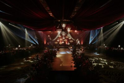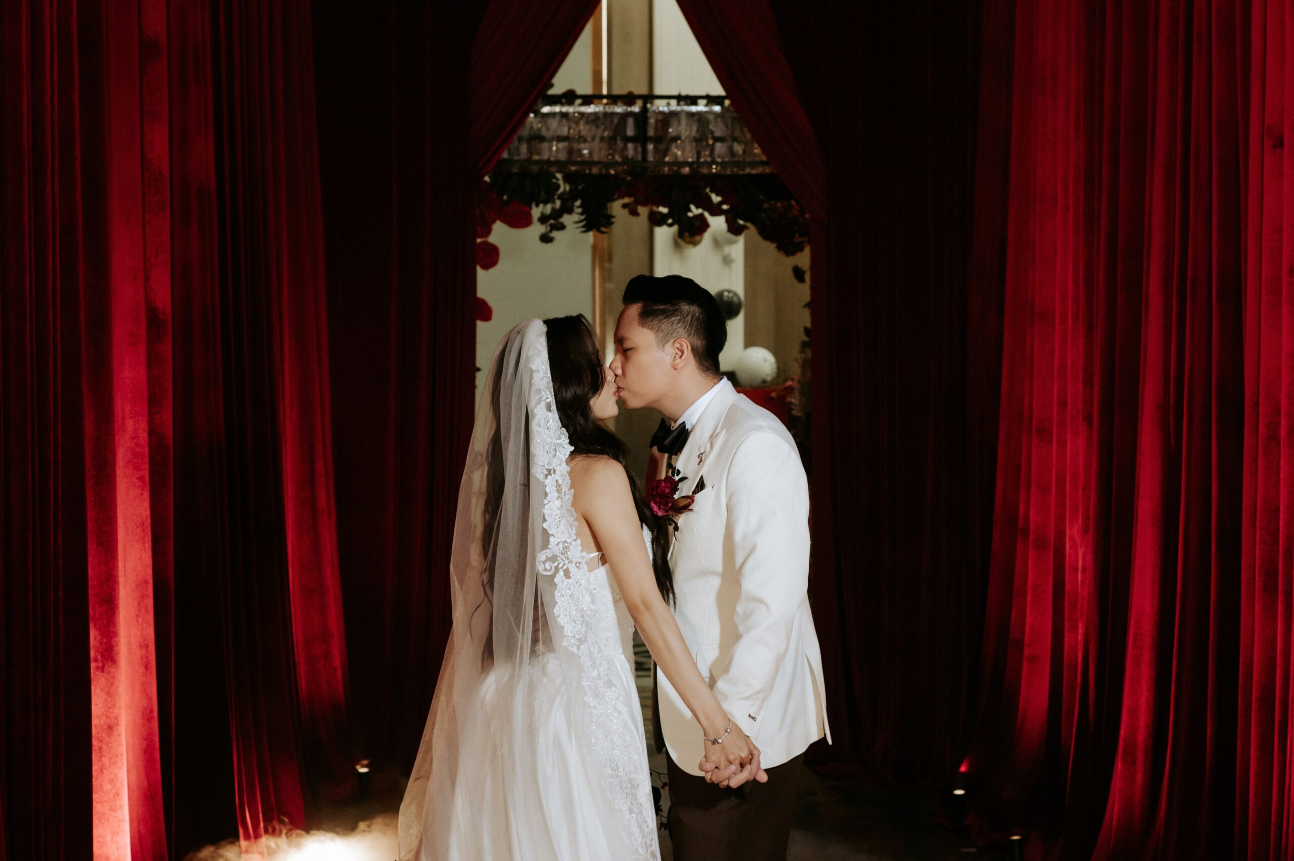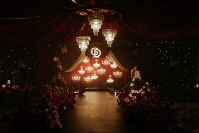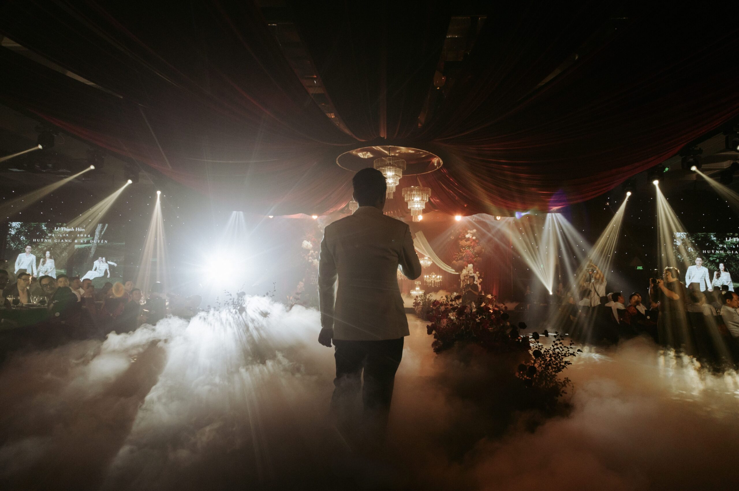 - Chất liệu điện ảnh: Tone đỏ Burgundy kết hợp với ánh sáng từ các khối đèn chùm pha lê cổ điển tạo nên những điểm nhấn sáng tối rõ ràng, thu hút thị giác. Từ sân khấu đến backdrop, ở mọi góc độ, đều như một khung hình đậm chất điện ảnh, có chiều sâu và sự tương phản rõ nét. Vì thế mà chất lãng mạn càng được làm nổi bật hơn.