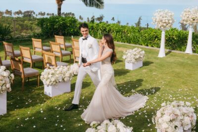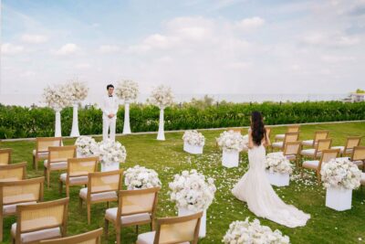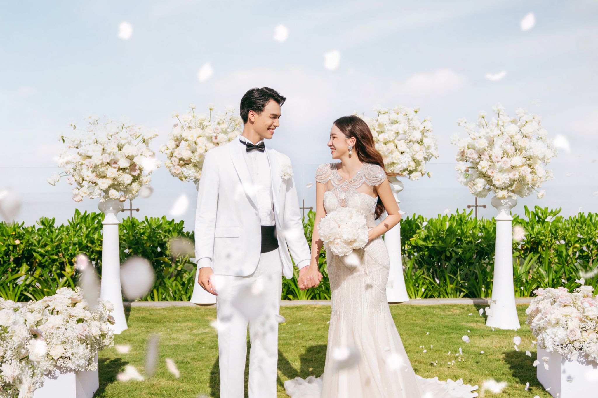 Concept đám cưới thiên đường “Paradise Vows” tập trung vào gam màu trắng tinh khiết làm ngôn ngữ xuyên suốt – không chỉ vì sự thanh lịch, mà còn bởi khả năng phản chiếu trọn vẹn ánh sáng và cảm xúc. Sắc trắng ấy trải dài từ không gian lễ vow đến bàn tiệc, như một lớp nền trong trẻo để mọi chi tiết nhỏ nhất đều có thể “thở”.