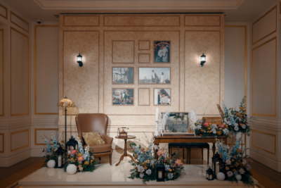 - Khu vực đón khách: “Palais de Flore” dành riêng một góc trang trọng để trưng bày những khung hình kỷ niệm của Khánh và Kennard. Khu vực gallery được bài trí như một góc thư viện trong dinh thự cổ với chiếc ghế bành da, đèn Tiffany cổ điển, chiếc điện thoại quay số và những khung ảnh được sắp đặt đầy tính nghệ thuật. Mỗi vật dụng đều như đang “thì thầm” về chặng hành trình mà cả hai đã bước qua, một cách kể chuyện đầy tinh tế.