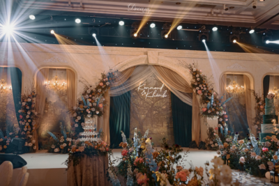 Concept đám cưới cổ điển “Palais de Flore” lấy cảm hứng từ khu vườn trong các tòa lâu đài châu Âu cổ kính, nơi ngập tràn sắc hoa và những bức tranh bích họa đầy sống động. “Palais de Flore” không đơn thuần là một concept trang trí mà là một bức tranh vườn cổ lãng mạn, nơi cảm xúc được ngàn hoa dẫn lối và thời gian cũng phải ngừng lại để câu chuyện tình yêu lên ngôi. Sắc xanh lục bảo, biểu tượng của sự sang trọng và thịnh vượng, được chọn làm điểm nhấn cho không gian kết hợp cùng với sắc vàng ánh kim đã khoác lên khu vườn cái khí chất vương giả của hoàng tộc. Đồng thời, khu vườn ấy còn được tô điểm bằng sắc cam, hồng và đặc biệt là màu xanh sapphire quyến rũ của phi yến khiến không gian concept đám cưới cổ điển “Palais de Flore” không chỉ đẹp mà còn làm cho các khách quan phải ngất ngây trước một vườn cổ kiểu Âu thơ mộng và ngập tràn hương sắc của tình yêu.