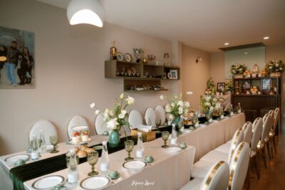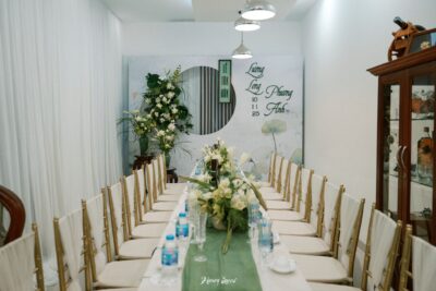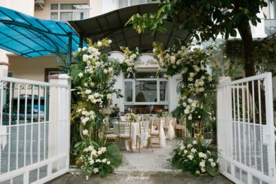 Tông màu trắng – xanh lá chủ đạo được điểm xuyết bằng chút xanh da trời ở nhà trai và hồng nhạt ở nhà gái đã giúp lễ cưới giữ được nét thanh lịch, nhẹ nhàng nhưng vẫn toát lên sự trang nghiêm đặc trưng của nghi lễ truyền thống. Từng đóa cẩm tú cầu trắng, hoa hồng trắng hay ly trắng được sắp đặt khéo léo không chỉ điểm thêm sắc tinh khôi, mà còn đang hòa nhịp cùng những câu chuyện yêu thương mà hai bạn dành cho nhau và cho đấng sinh thành.