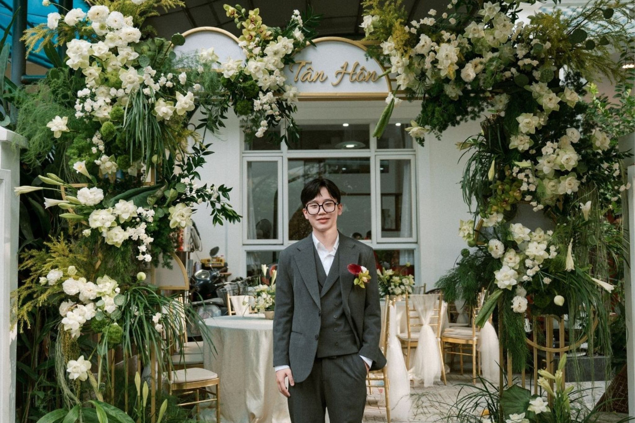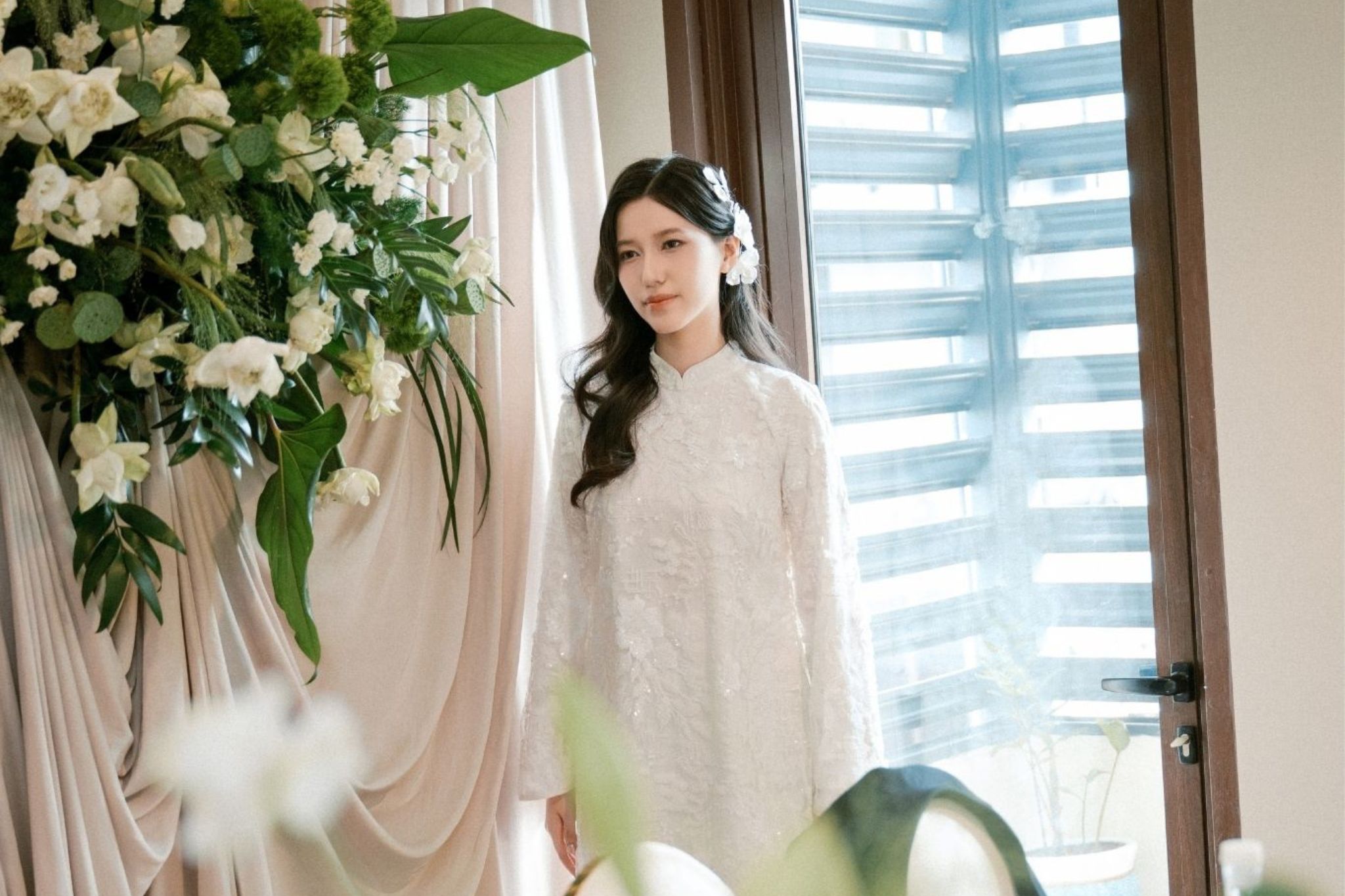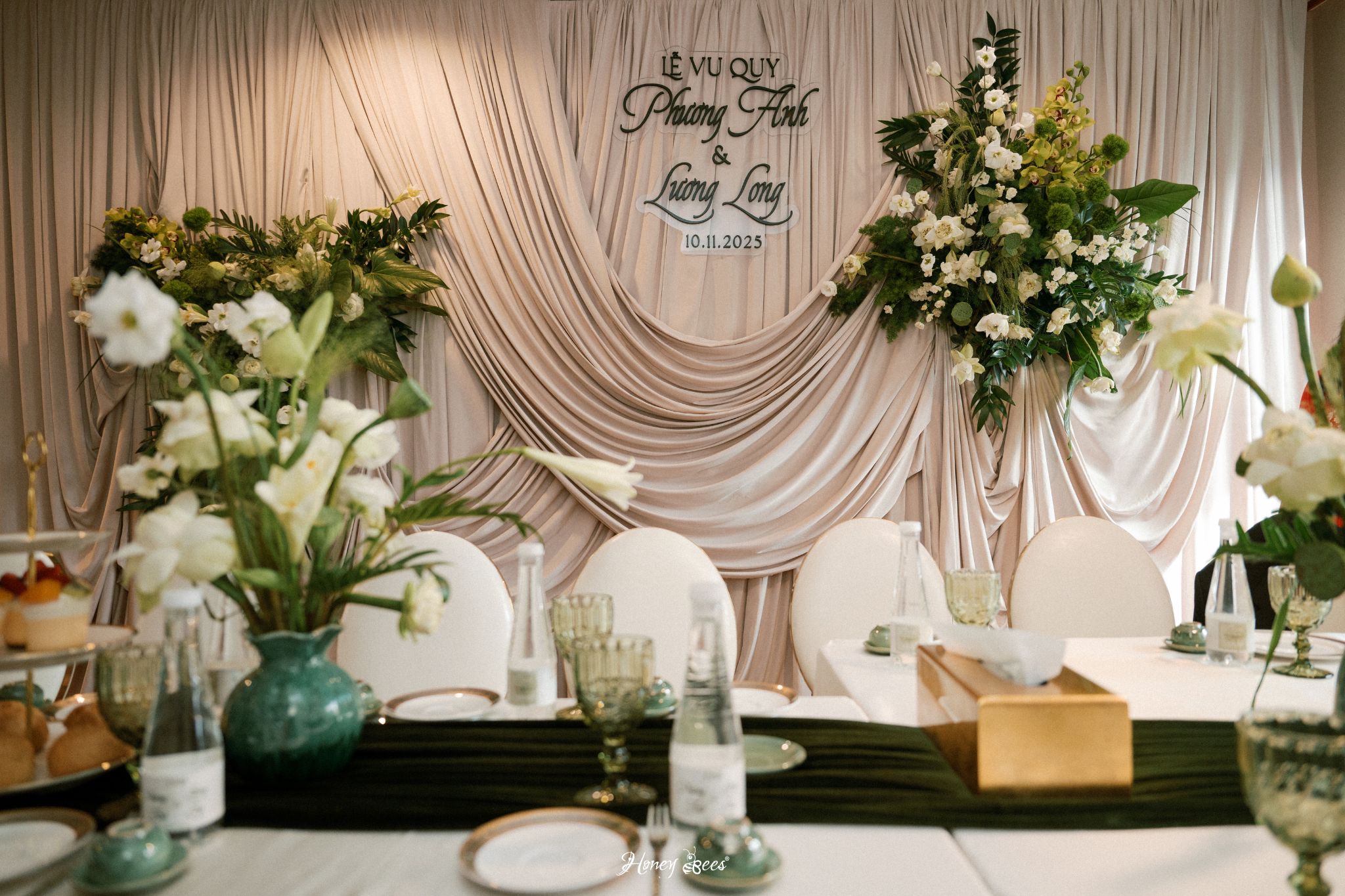 Tông màu trắng – xanh lá chủ đạo được điểm xuyết bằng chút xanh da trời ở nhà trai và hồng nhạt ở nhà gái đã giúp lễ cưới giữ được nét thanh lịch, nhẹ nhàng nhưng vẫn toát lên sự trang nghiêm đặc trưng của nghi lễ truyền thống. Từng đóa cẩm tú cầu trắng, hoa hồng trắng hay ly trắng được sắp đặt khéo léo không chỉ điểm thêm sắc tinh khôi, mà còn đang hòa nhịp cùng những câu chuyện yêu thương mà hai bạn dành cho nhau và cho đấng sinh thành.
