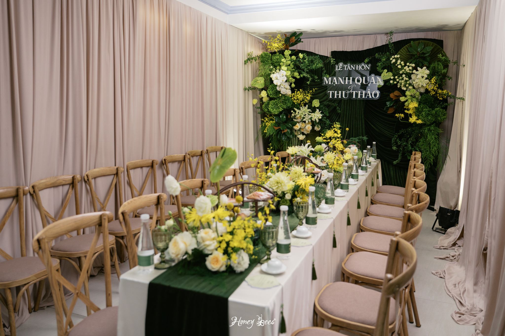 HONEY BEES đã thiết kế Lễ Gia Tiên như một góc ký ức: backdrop gia tiên được trang trí thanh lịch, với các cụm hoa lan-ly-cúc trắng xếp lớp, điểm thêm lá dương xỉ để tạo chiều sâu. Màu vàng xuất hiện ở những chi tiết phụ — nơ, viền bàn thờ, hoặc ánh đèn nhỏ — khiến tổng thể vừa ấm vừa trang nghiêm.