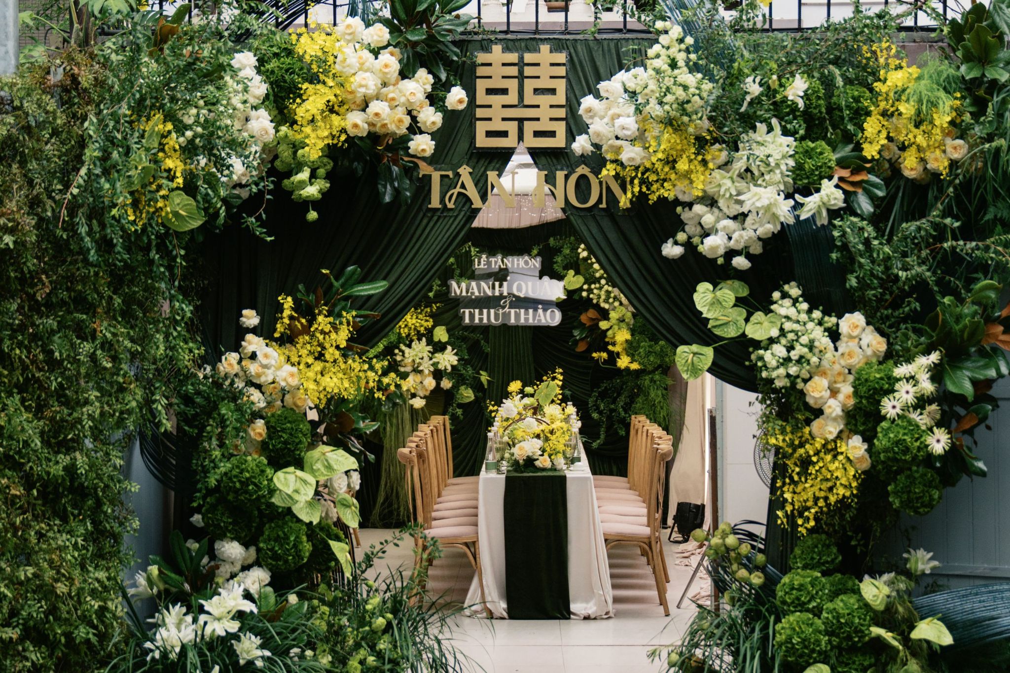 - Tính biểu tượng trong từng chi tiết: Lá dương xỉ tượng trưng cho sức sống, hoa cúc trắng cho sự thuần khiết — tất cả gợi nhắc hành trình bền bỉ của đôi uyên ương. Những tán lá dương xỉ được đan xen khéo léo giữa các cụm hoa, tạo thành lớp nền xanh mượt, đưa ánh sáng nắng xuyên qua, khiến không gian như thở và chuyển động theo từng nhịp cảm xúc.