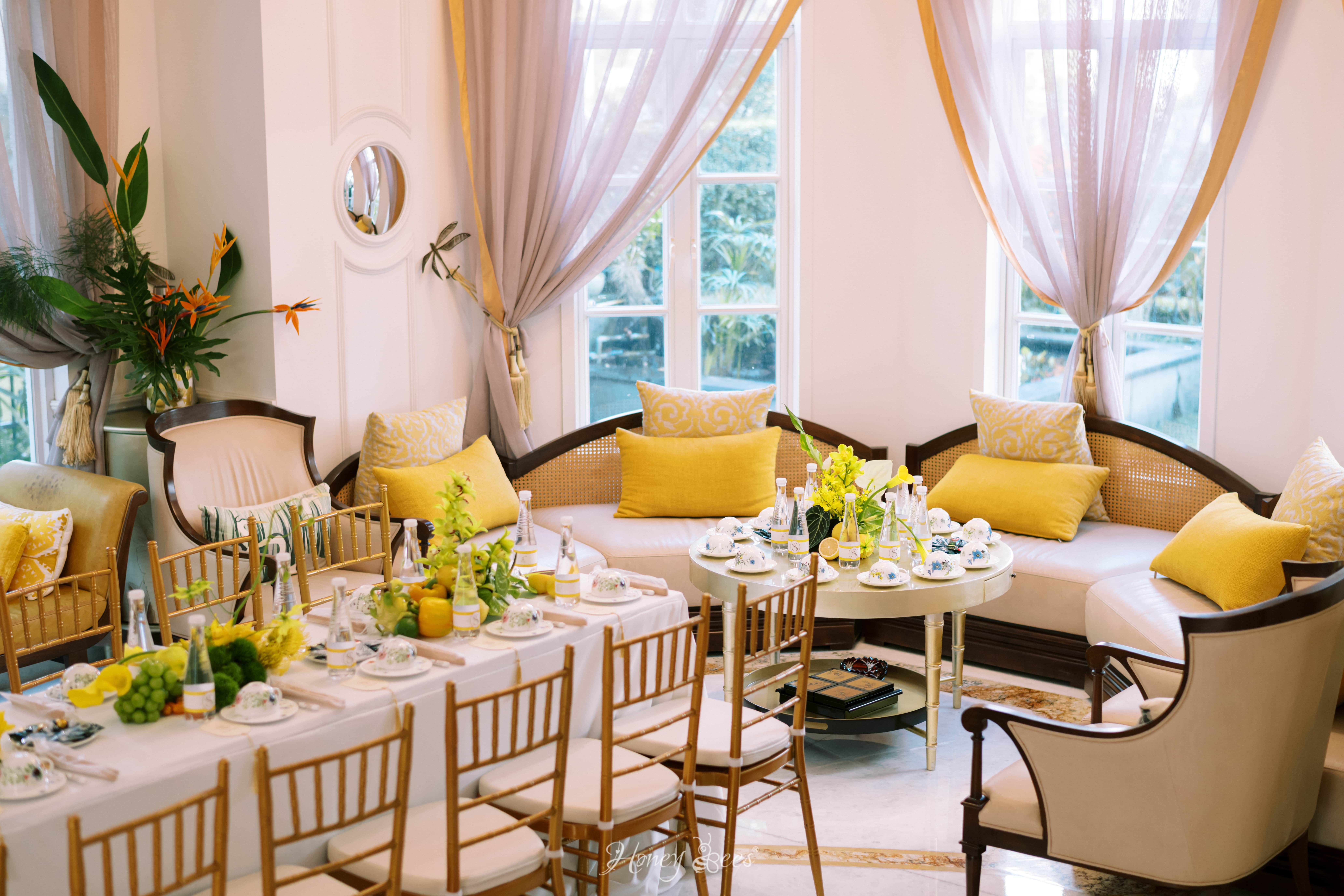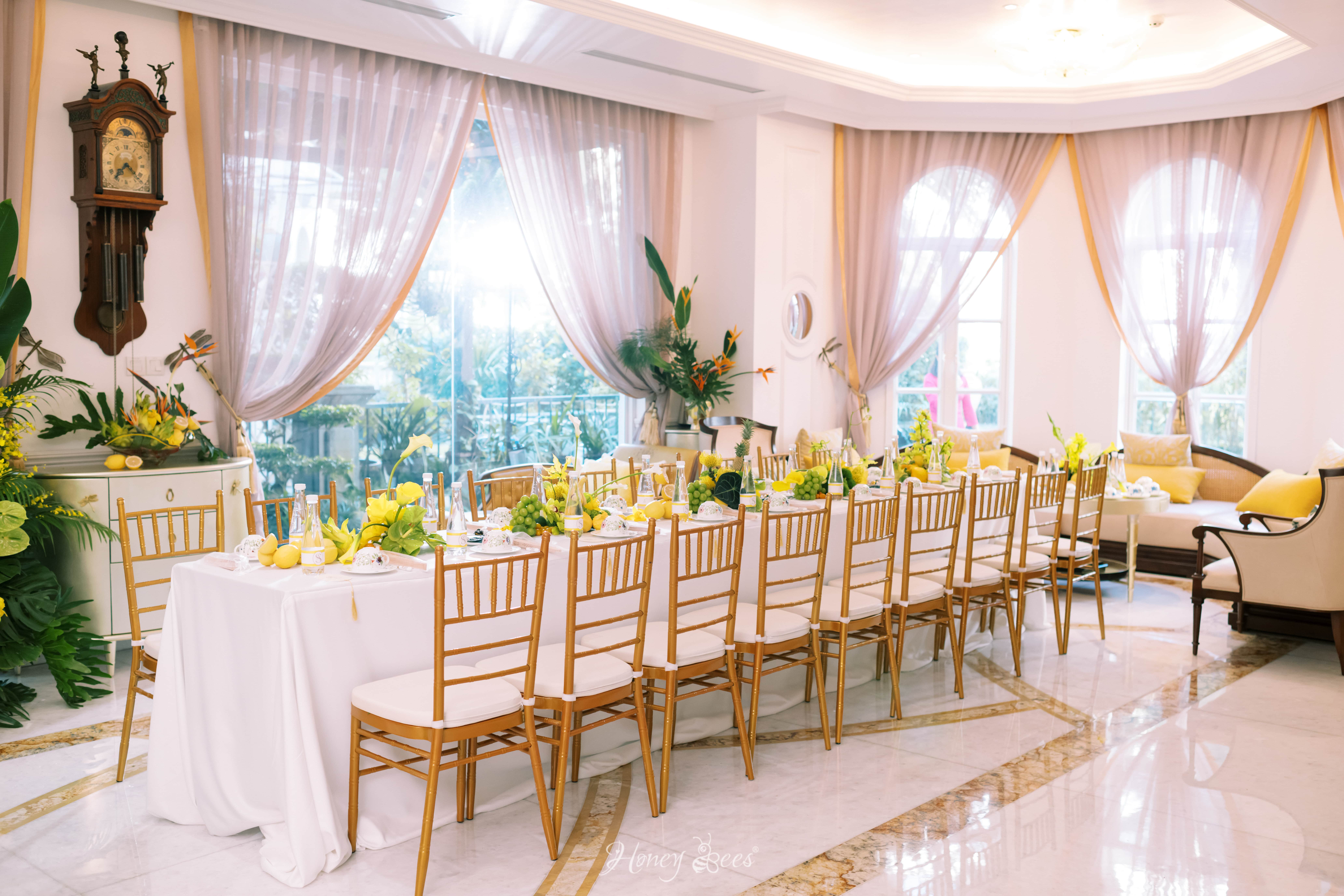 Không gian buổi lễ mở ra như một khu vườn nhiệt đới rực rỡ nhưng mang hơi thở sang trọng của sắc vàng và ánh sáng tự nhiên. Chanh vàng, thanh long, nho xanh, cà chua bi, chuối… hòa cùng những đóa hoa nhập khẩu – địa lan, lan vũ nữ, calla lily vàng, cẩm tú cầu, hồng môn xanh – tạo nên một tổng thể tinh tế và liền mạch, nơi sắc vàng không chỉ là màu của nắng, mà là biểu tượng của tình yêu trọn vẹn và khởi đầu viên mãn.