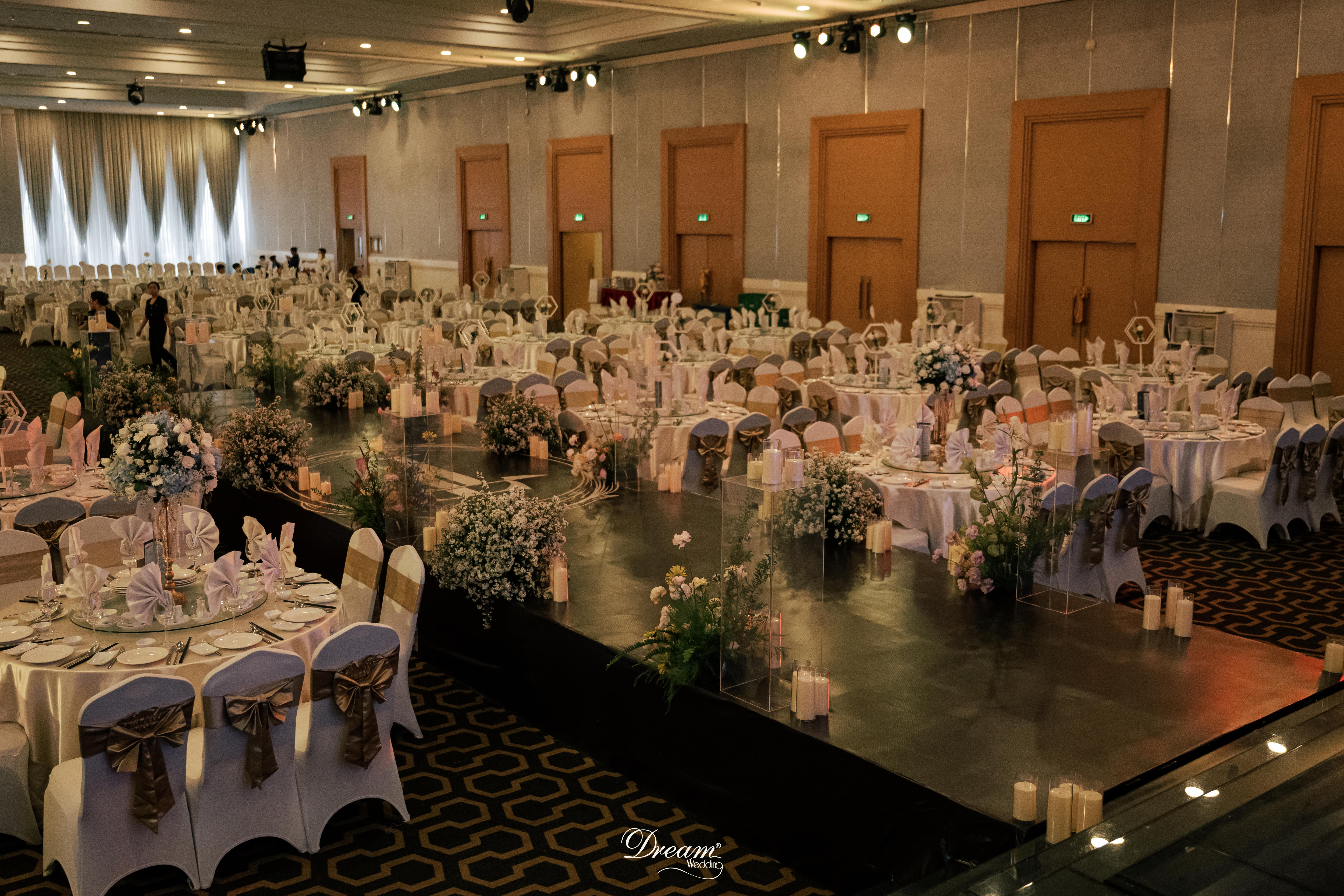 Cách trang trí không gian không chỉ dừng lại ở vẻ lộng lẫy, mà còn khẽ chạm đến tinh tế. Hàng ngàn cánh hoa xếp lớp, tầng tầng rủ xuống, hòa cùng ánh sáng vàng ấm áp, gợi nên hình ảnh một khu vườn thần tiên vừa hé mở giữa lòng thành phố. Lụa mềm và sắc kim loại mỏng được điểm xuyết như những nốt nhạc dịu dàng, giữ cho toàn cảnh vừa sang trọng, vừa khoáng đạt, mà không quá choáng ngợp.