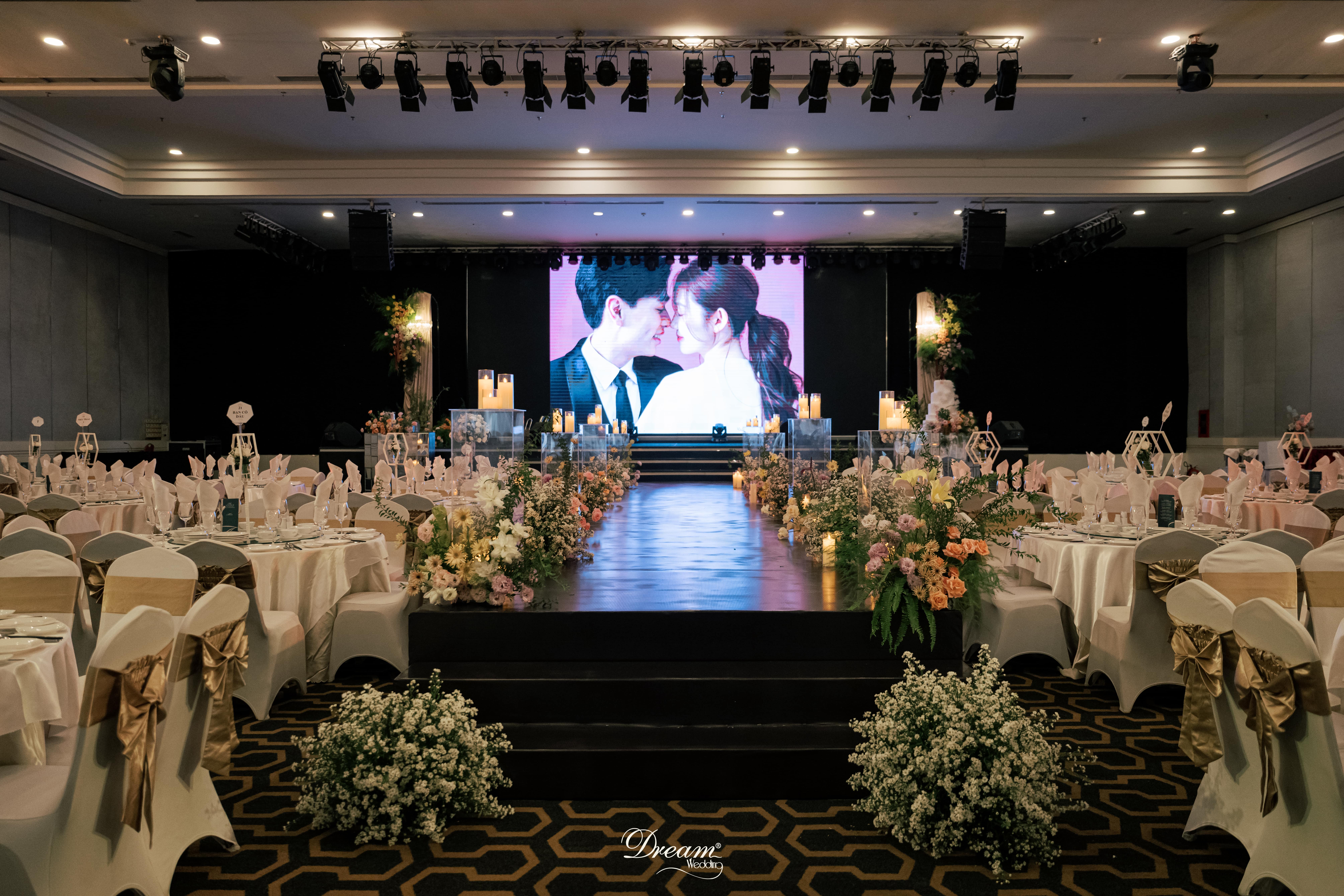 • Wedding decor cá nhân hóa: Mỗi chi tiết trong trang trí đều được Dream Wedding tinh chỉnh theo mong muốn của cặp đôi – từ sắc hoa, ánh sáng đến phông nền. Nhờ đó, lễ cưới không chỉ đẹp mà còn mang đậm dấu ấn riêng. Như trong bản tình ca của Tuấn và Trúc, màu trắng tinh khôi hiện diện khắp nơi trong không gian đám cưới, từ hoa cưới đến nến thơm, tất cả như đang khoác lên cho ngày thành đôi của cặp tình nhân sự trong trẻo, chan hòa trong hạnh phúc.