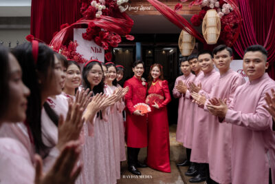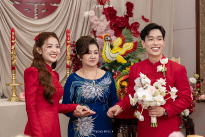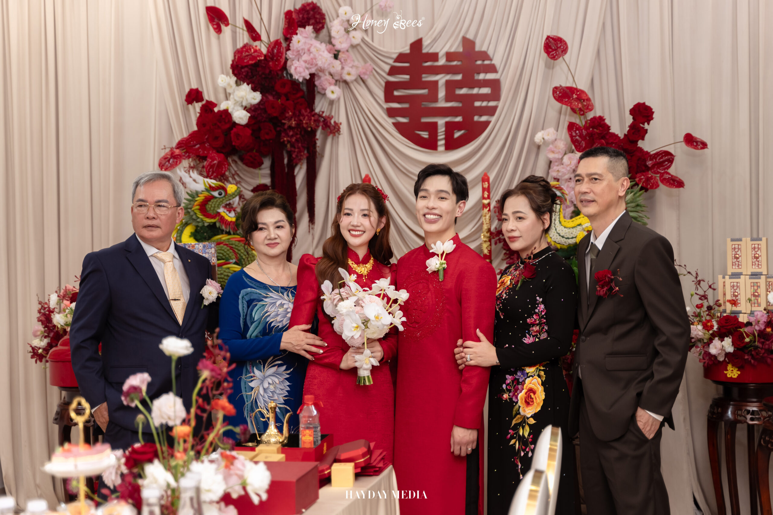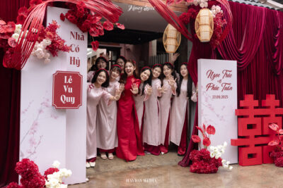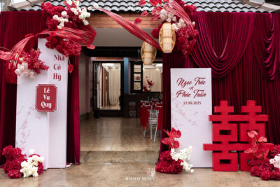 - Sự hòa quyện giữa truyền thống và hiện đại: Từ phông Gia Tiên đỏ thắm – chữ Hỷ vàng son trang nghiêm đến cổng hoa hiện đại mềm mại, mọi chi tiết đều cân bằng, giúp buổi lễ vừa gần gũi với phong tục Việt, vừa toát lên phong cách sang trọng.