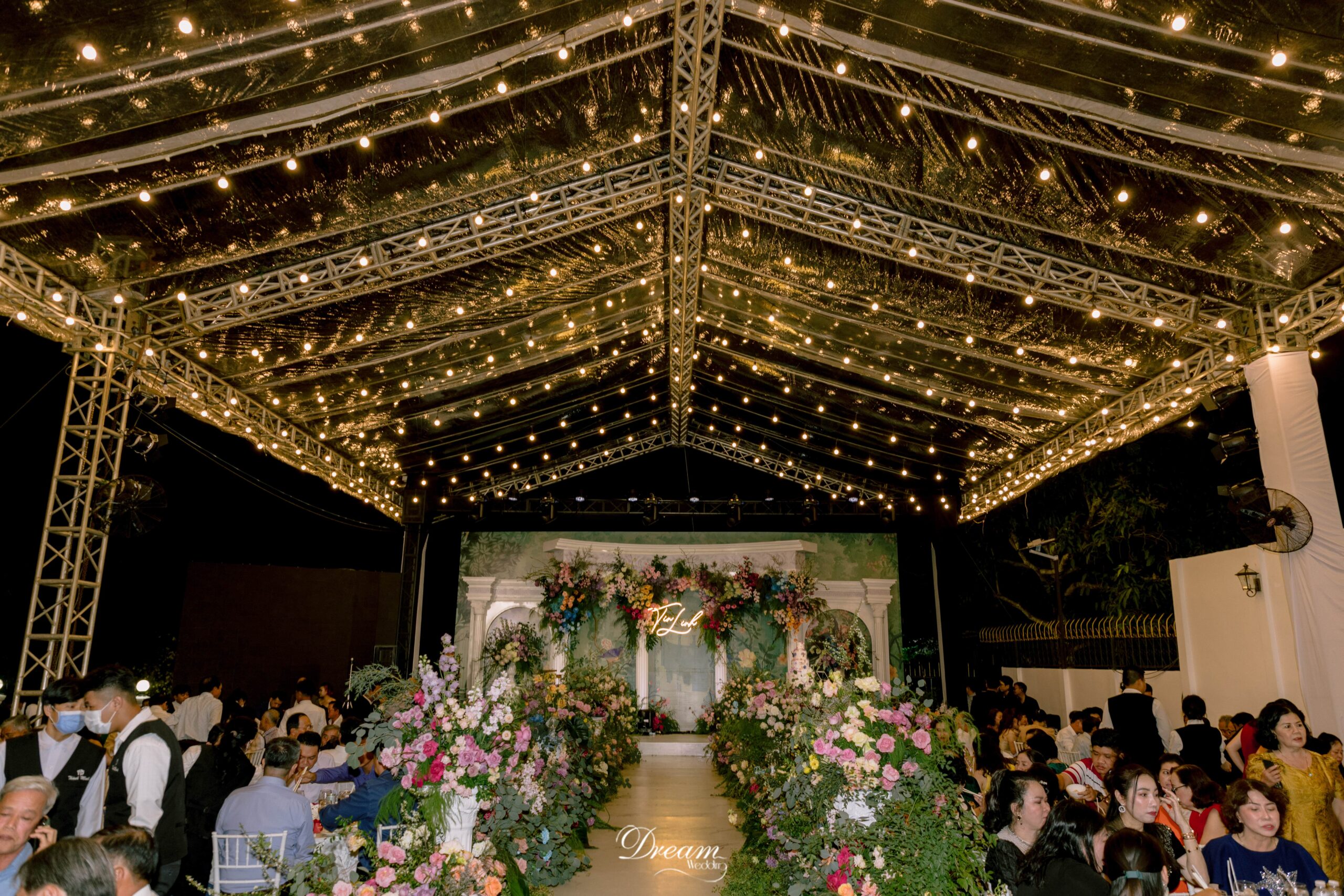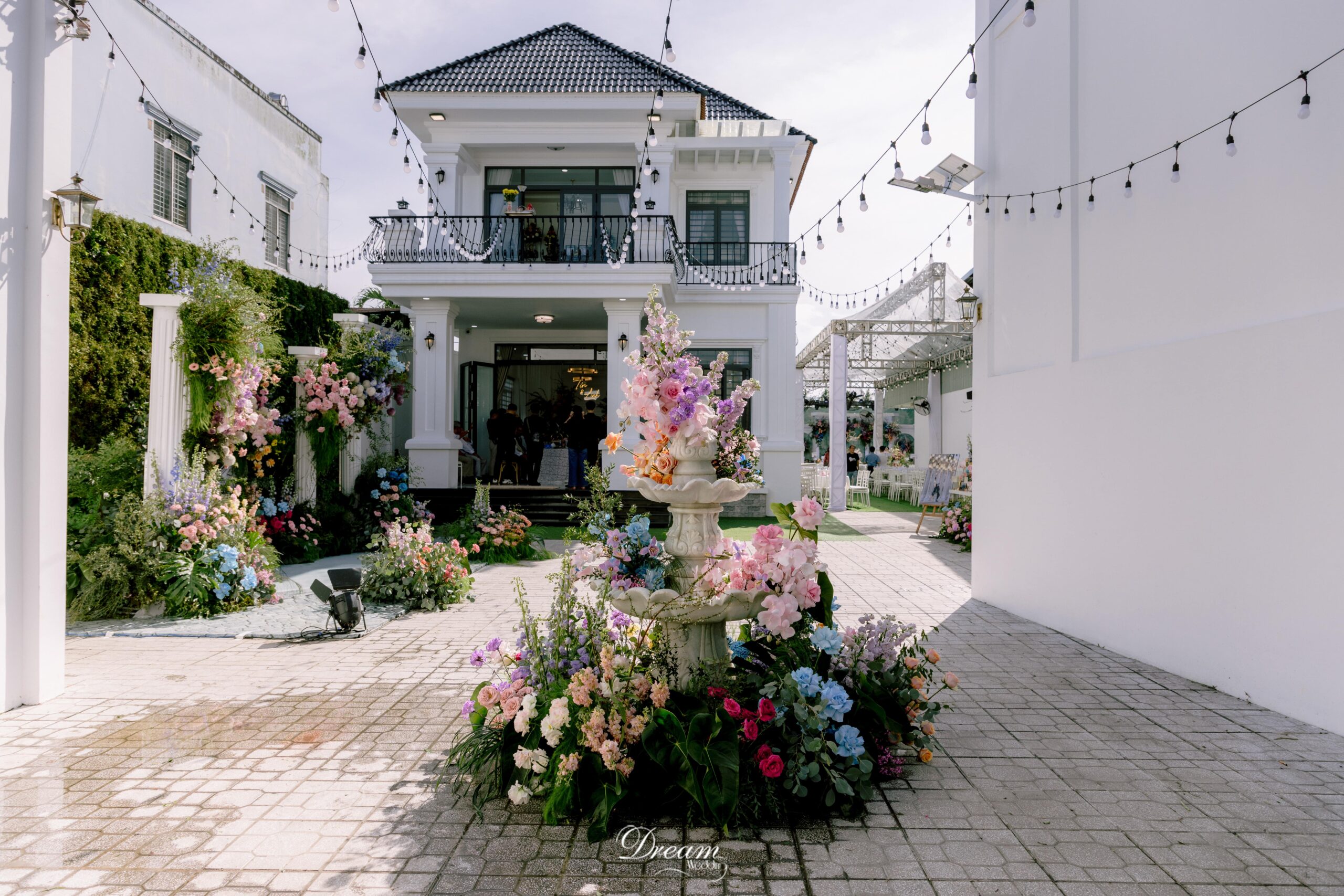 - Không gian như một khu vườn châu Âu giữa lòng miền Tây: Lễ cưới được tổ chức tại quê nhà chú rể Phước Tín ở Tiền Giang, nhưng Dream Wedding đã biến nơi ấy thành một khu vườn hoa rực rỡ và lãng mạn. Từ bức tường và các trụ đá mang nét cổ điển đến những khóm hoa được cắm tỉ mỉ, mọi thứ như hòa quyện để tạo nên bầu không khí vừa thơ mộng, vừa gần gũi.