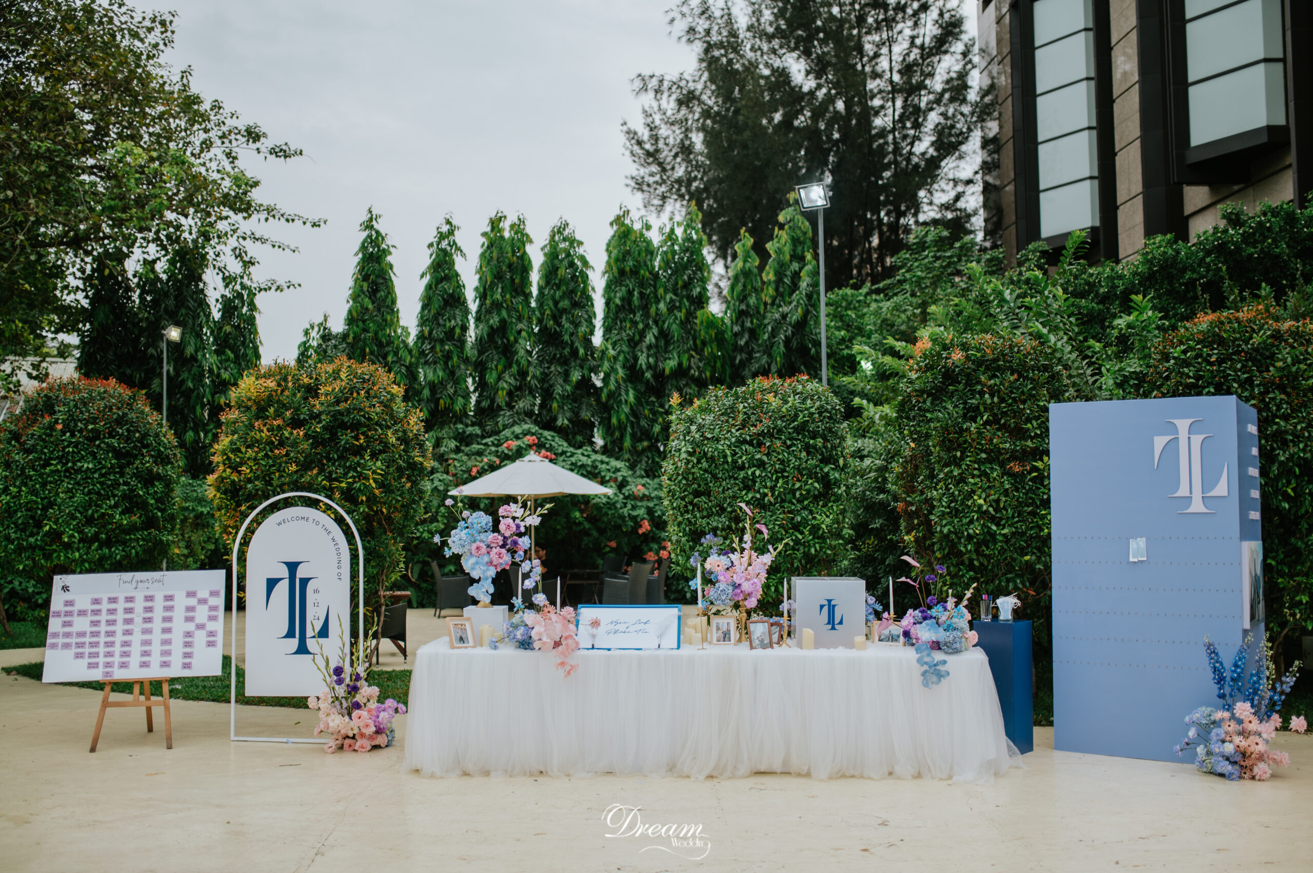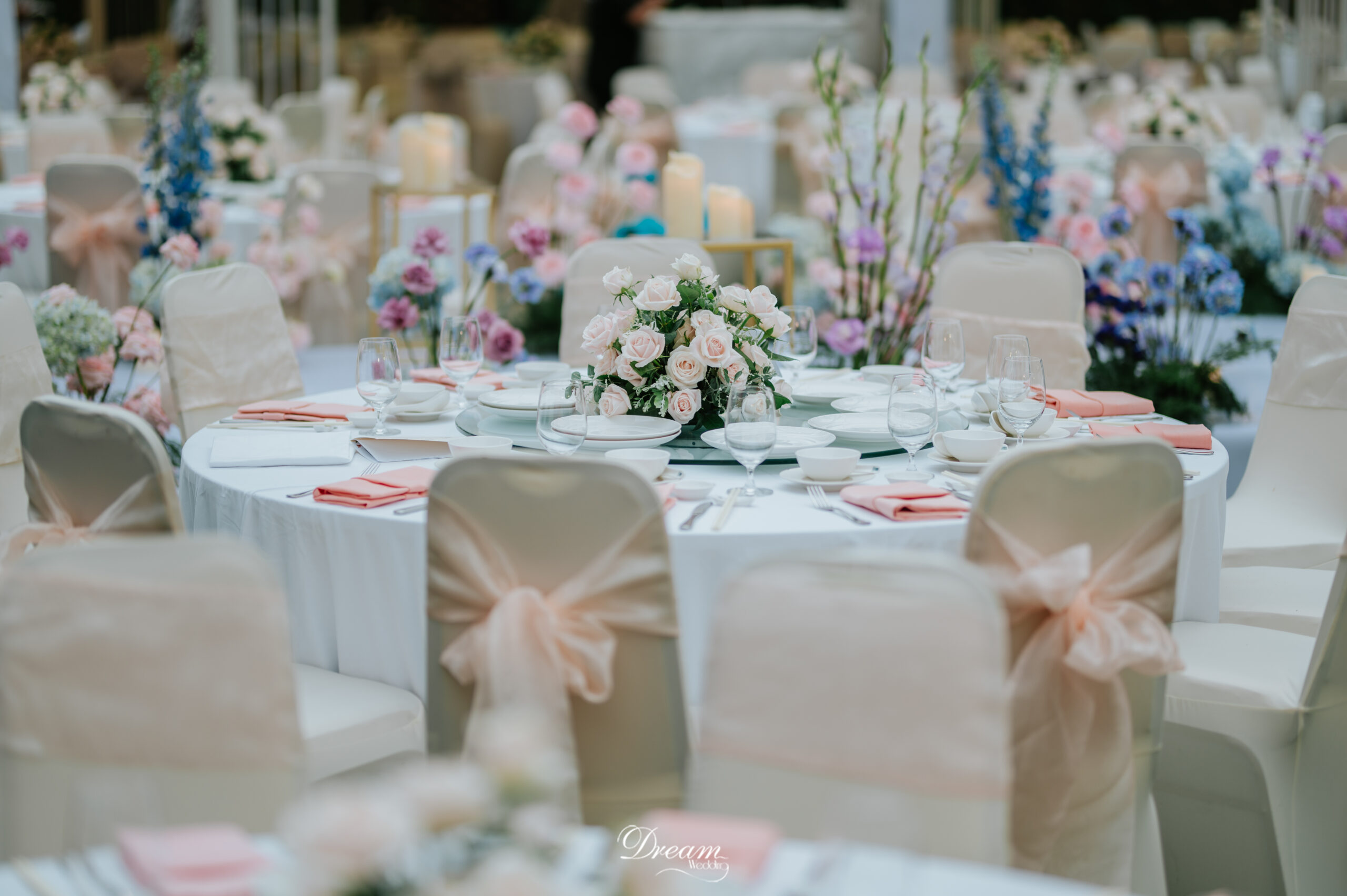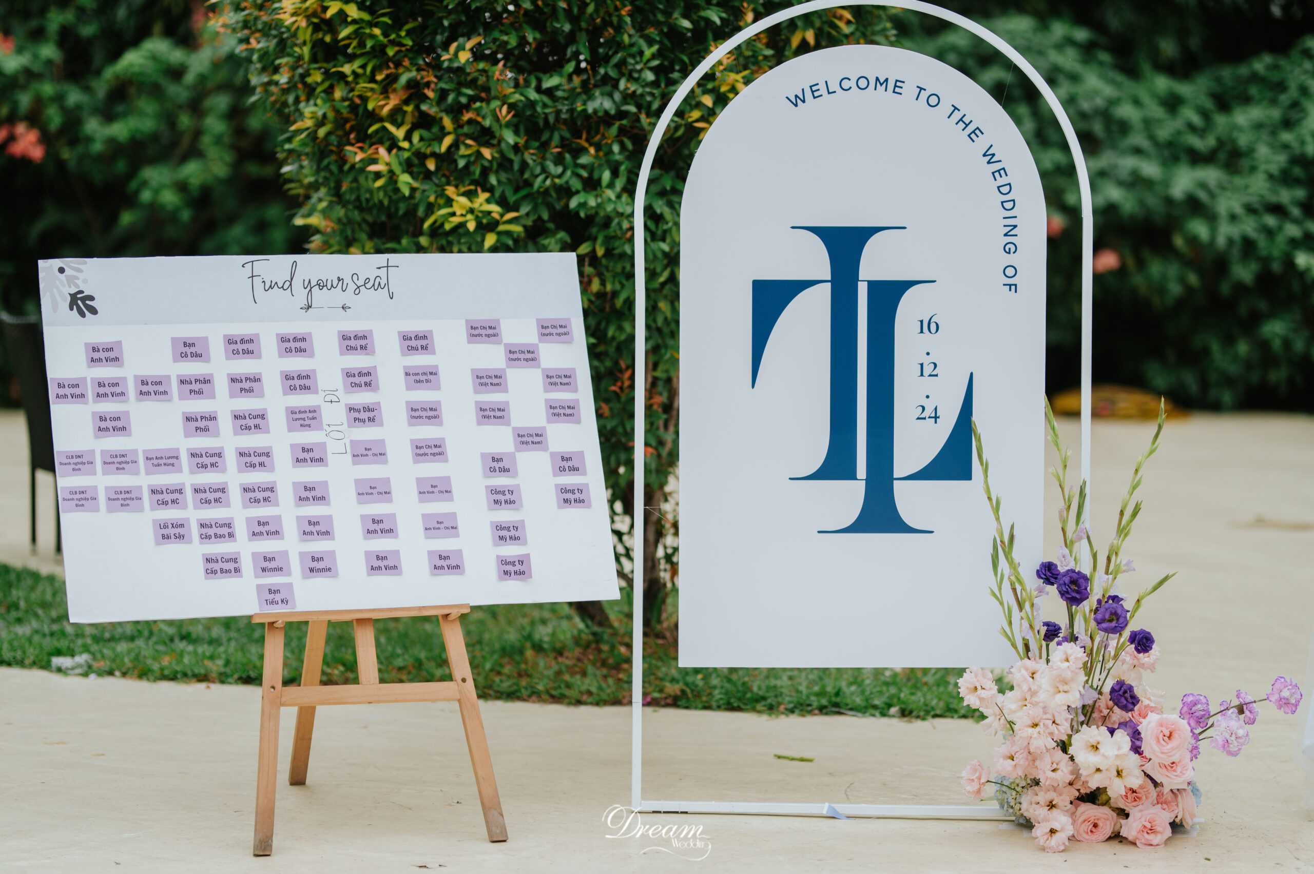 “Azure Dreams” – đúng như tên gọi – là giấc mơ được dệt nên từ sắc xanh dương, biểu tượng của sự an yên và lòng thủy chung. Lấy cảm hứng từ màu sắc yêu thích của cặp đôi Tín và Linh, Dream Wedding đã khéo léo hòa quyện tone xanh chủ đạo cùng những sắc màu phụ như hồng pastel, tím nhạt và trắng tinh khôi, tạo nên một không gian cưới vừa trẻ trung, vừa lãng mạn.