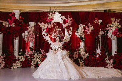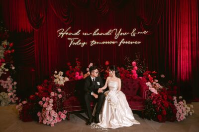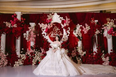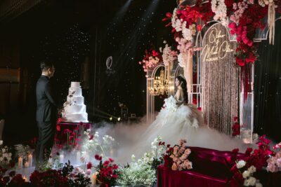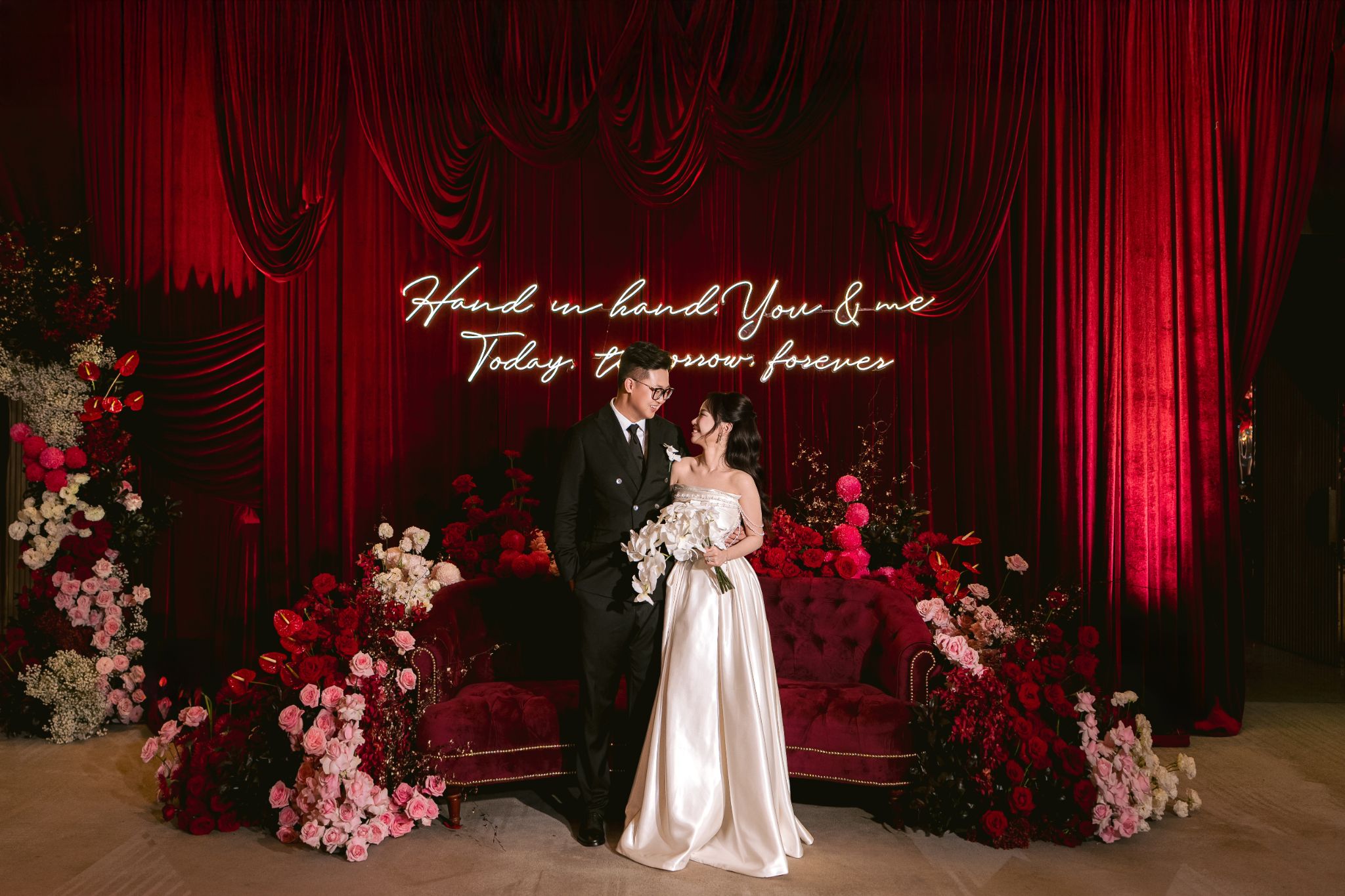 Thẩm mỹ nổi bật và giàu cảm xúc: Sắc đỏ nhung kết hợp ánh sáng vàng tạo nên không gian lộng lẫy, vừa cổ điển vừa hiện đại. Mỗi góc từ bàn Gallery cho khu vực Backdrop đều mang lại cảm giác trang trọng và tôn vinh vẻ đẹp của cặp đôi trong từng khung hình.