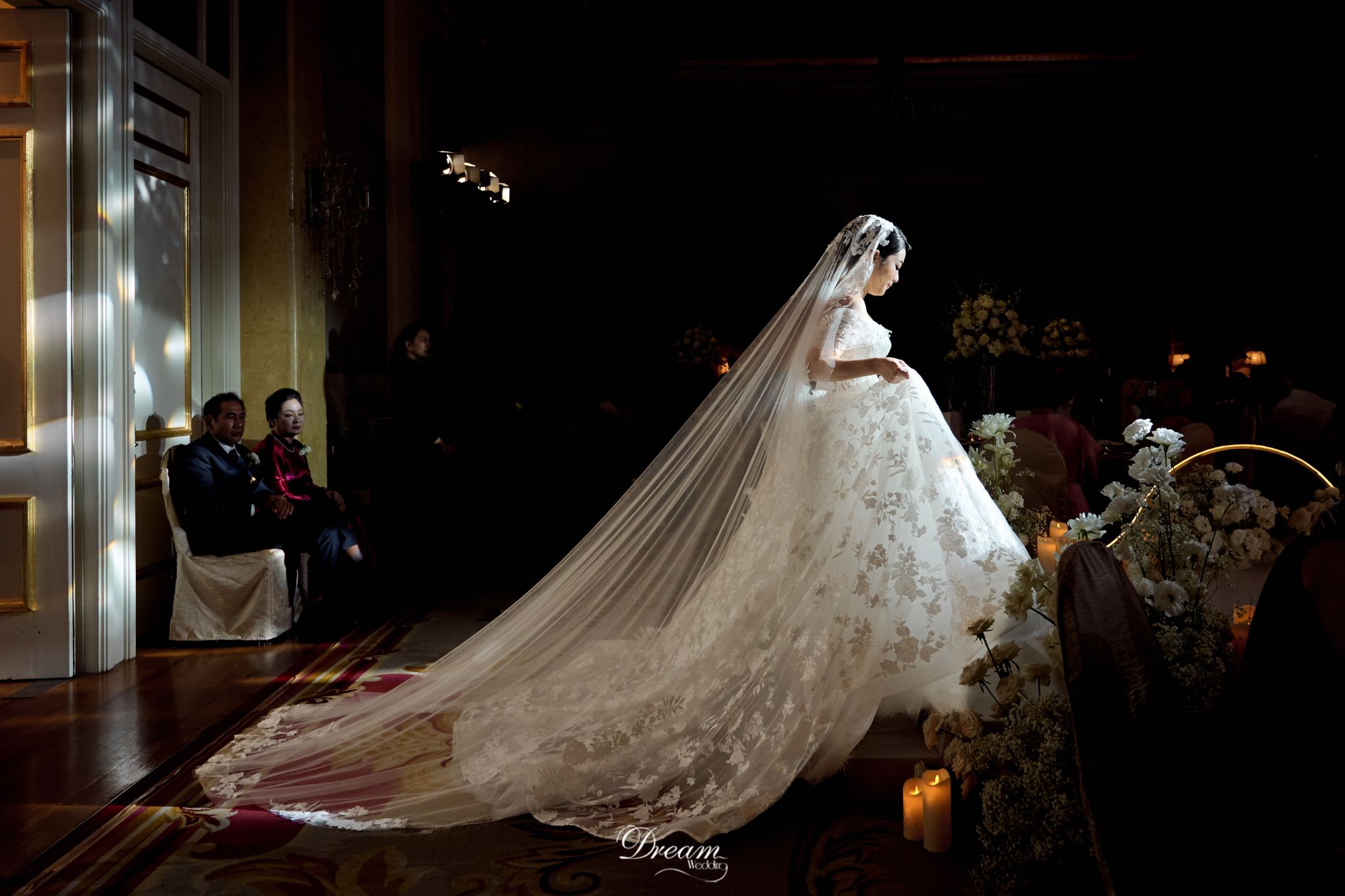 • Ánh vàng nghệ thuật: Tông vàng ấm mang đến cảm giác như ánh hoàng hôn phủ lên buổi lễ. Nó làm dịu không gian, tôn lên vẻ rạng rỡ của cô dâu chú rể như hai nhân vật chính trong một khung tranh được ánh sáng ưu ái.
