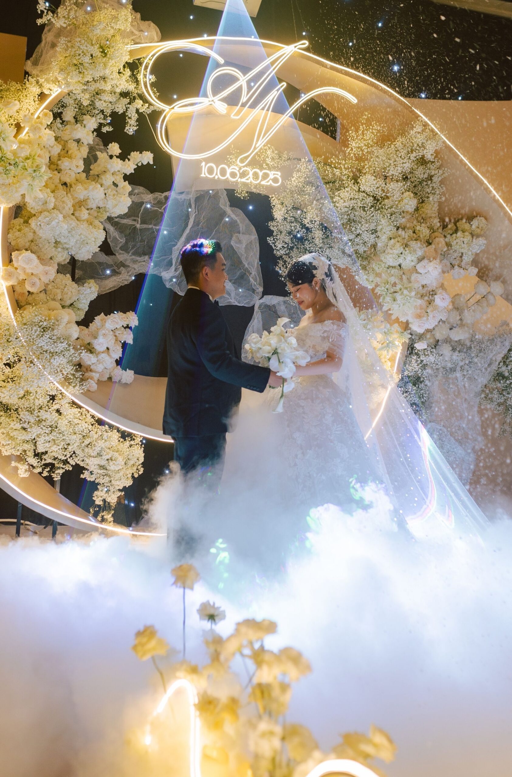 - Ánh vàng nghệ thuật: Tông vàng ấm mang đến cảm giác như ánh hoàng hôn phủ lên buổi lễ. Nó làm dịu không gian, tôn lên vẻ rạng rỡ của cô dâu chú rể như hai nhân vật chính trong một khung tranh được ánh sáng ưu ái.