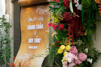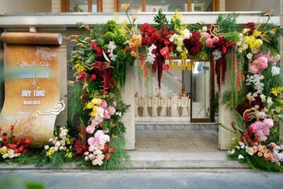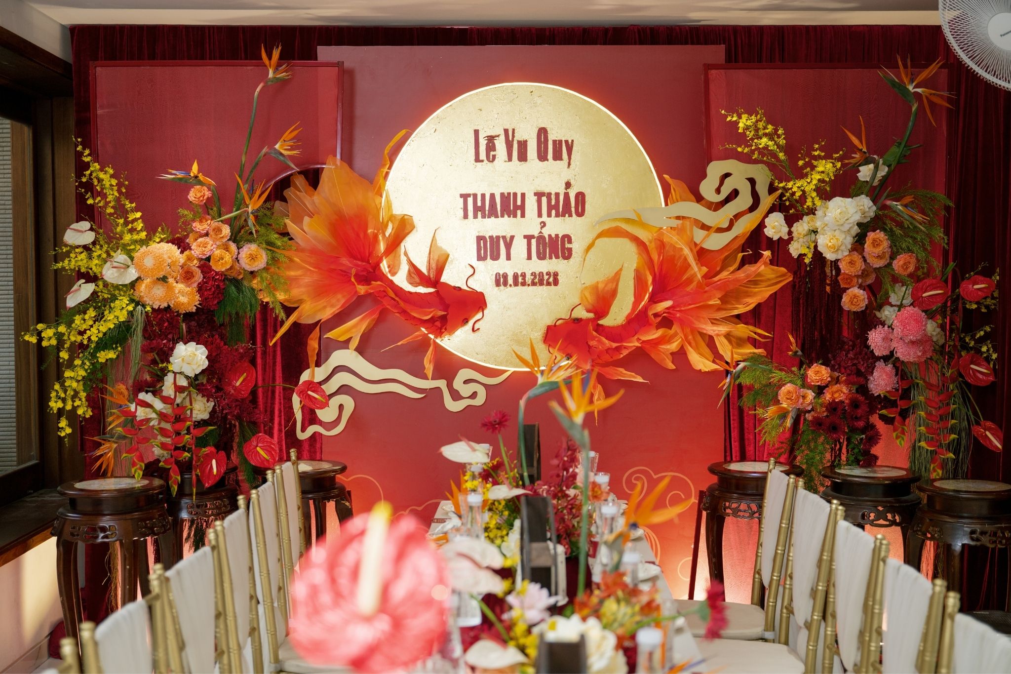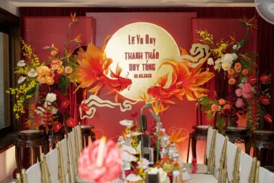 Những dải hoa nhiệt đới được cắm kết bất đối xứng, kết hợp cùng sự chuyển sắc uyển chuyển giữa các gam màu nóng đã tạo nên một tổng thể thị giác vô cùng hài hòa. Bên cạnh đó, bằng cách chắt lọc và tiết chế các yếu tố trang trí, cùng với sự hài hòa giữa các biểu tượng trong văn hóa Á Đông và tư duy thẩm mỹ hiện đại concept đám cưới cổ điển “Lý Ngư Hỷ Sự” đã tôn vinh trọn vẹn vẻ đẹp truyền thống bằng một ngôn ngữ nghệ thuật đầy tinh tế, sang trọng và giàu cảm xúc.