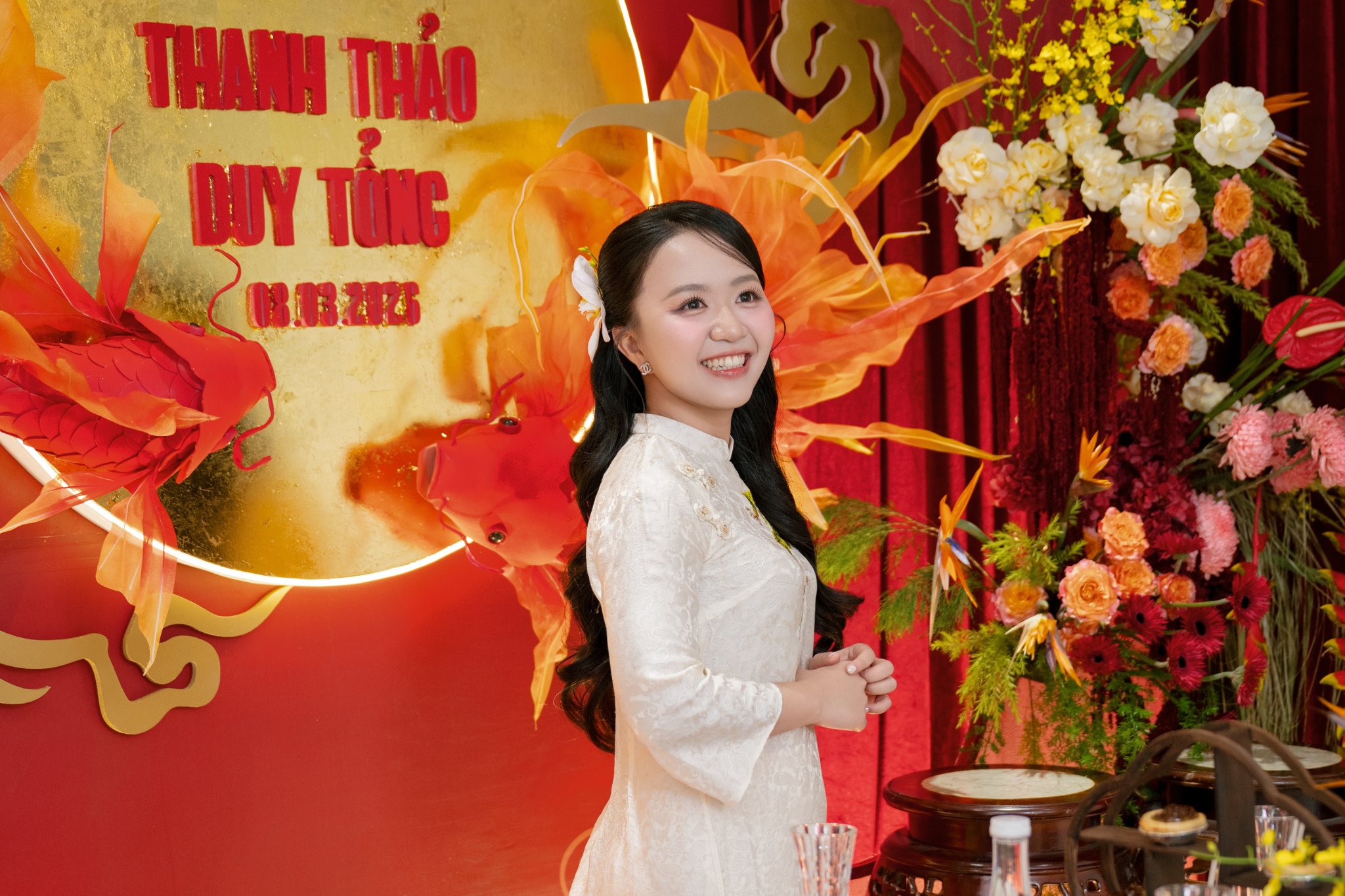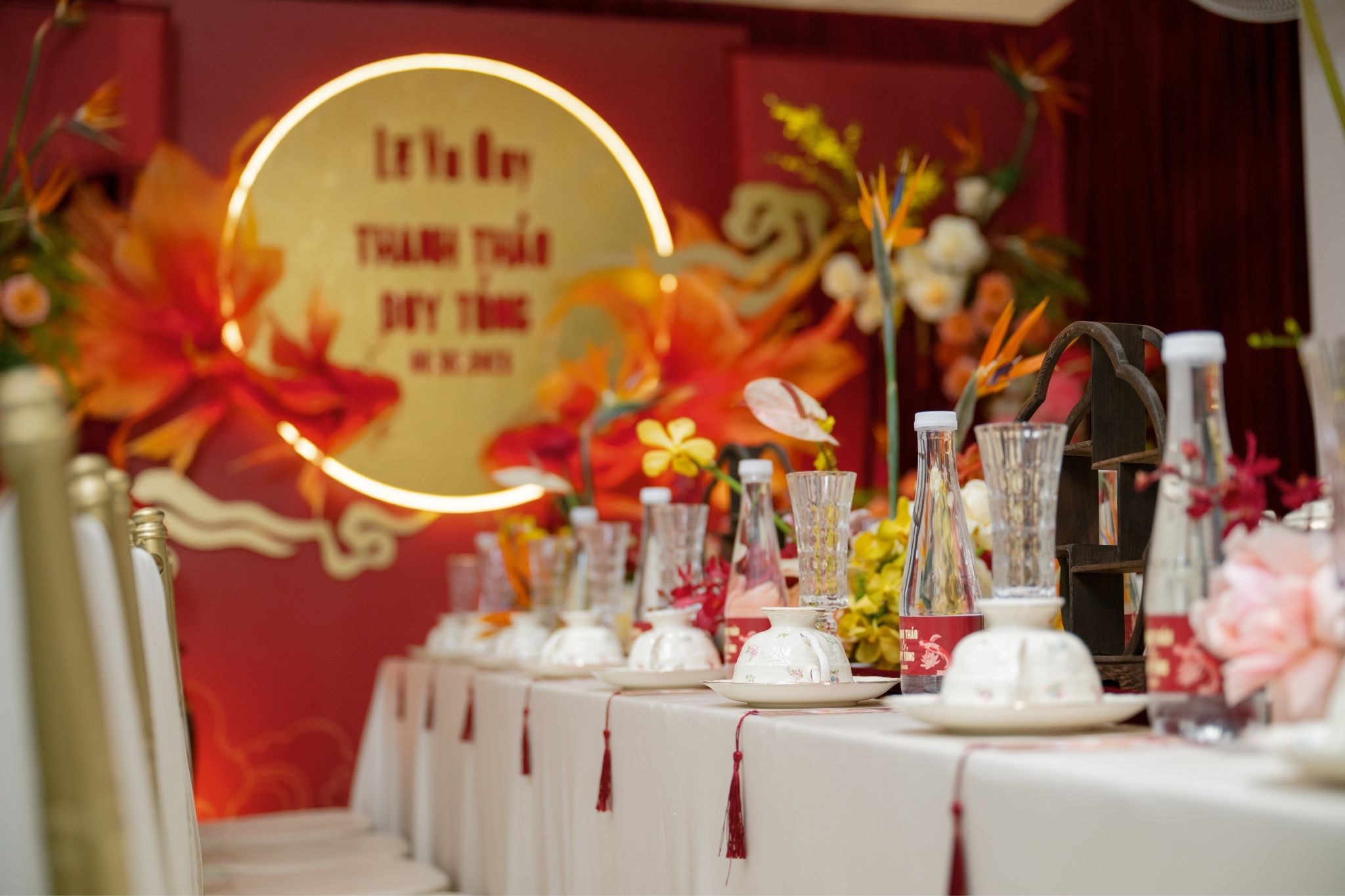 Concept đám cưới cổ điển “Lý Ngư Hỷ Sự” là sự giao hòa tinh tế giữa các biểu tượng văn hóa Á Đông và tư duy thẩm mỹ hiện đại để có thể kể trọn vẹn hành trình tình yêu của Thảo và Tổng. Vì thế mà không gian Lễ Vu Quy như một bức tranh hoài cổ, nổi bật với sự pha trộn giữa sắc đỏ son truyền thống cùng tông cam, vàng kim quyền quý. Hình ảnh cá chép, biểu tượng của sự may mắn, được đặt làm trọng tâm, mang theo ngụ ý về một tình yêu bắt nguồn từ những điều nhỏ bé nhất cho đến ngày đơm hoa kết trái. Cùng với đó là hình ảnh mặt trăng cũng được lồng ghép khéo léo vào không gian như một lời chúc cho sự viên mãn, tròn đầy.