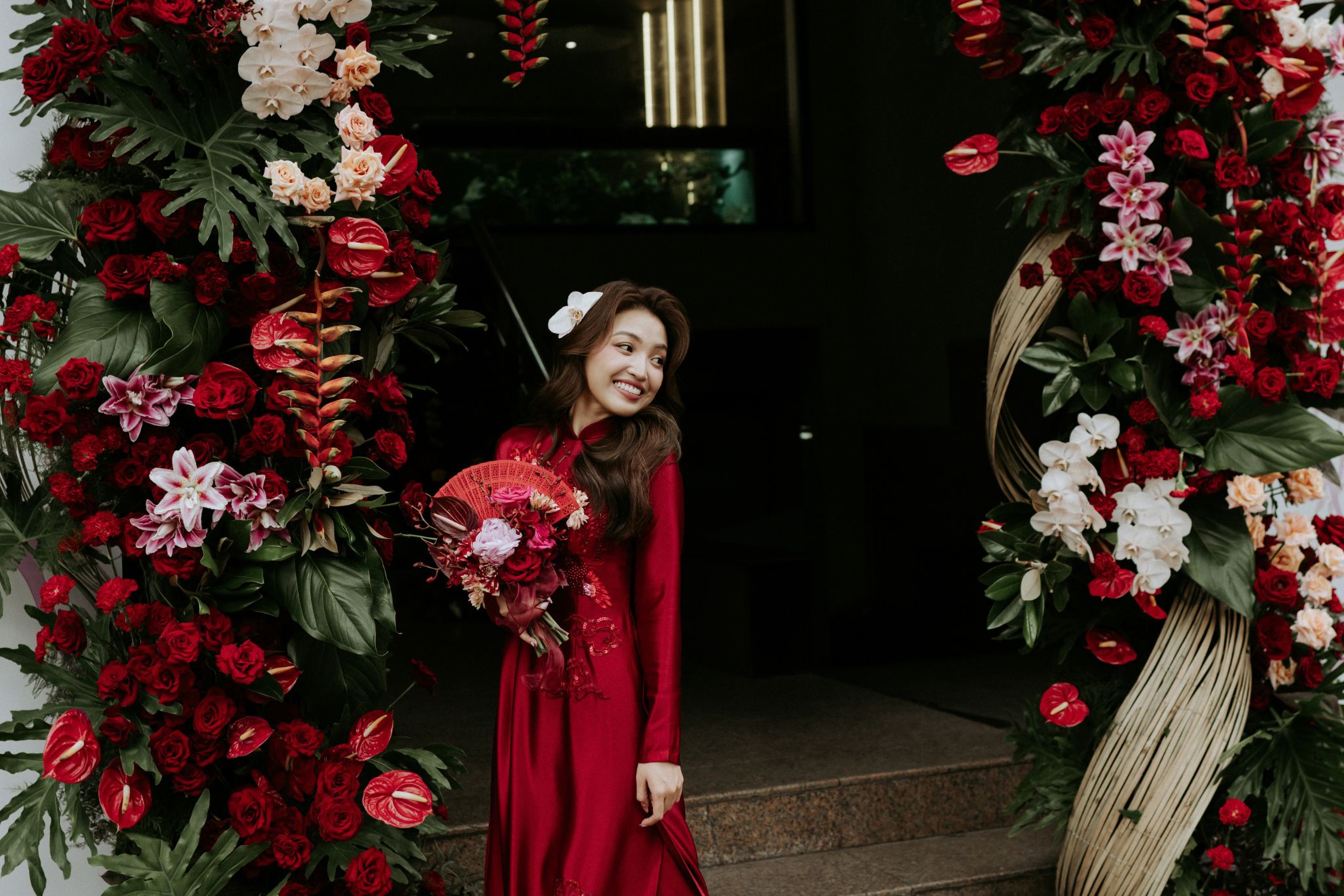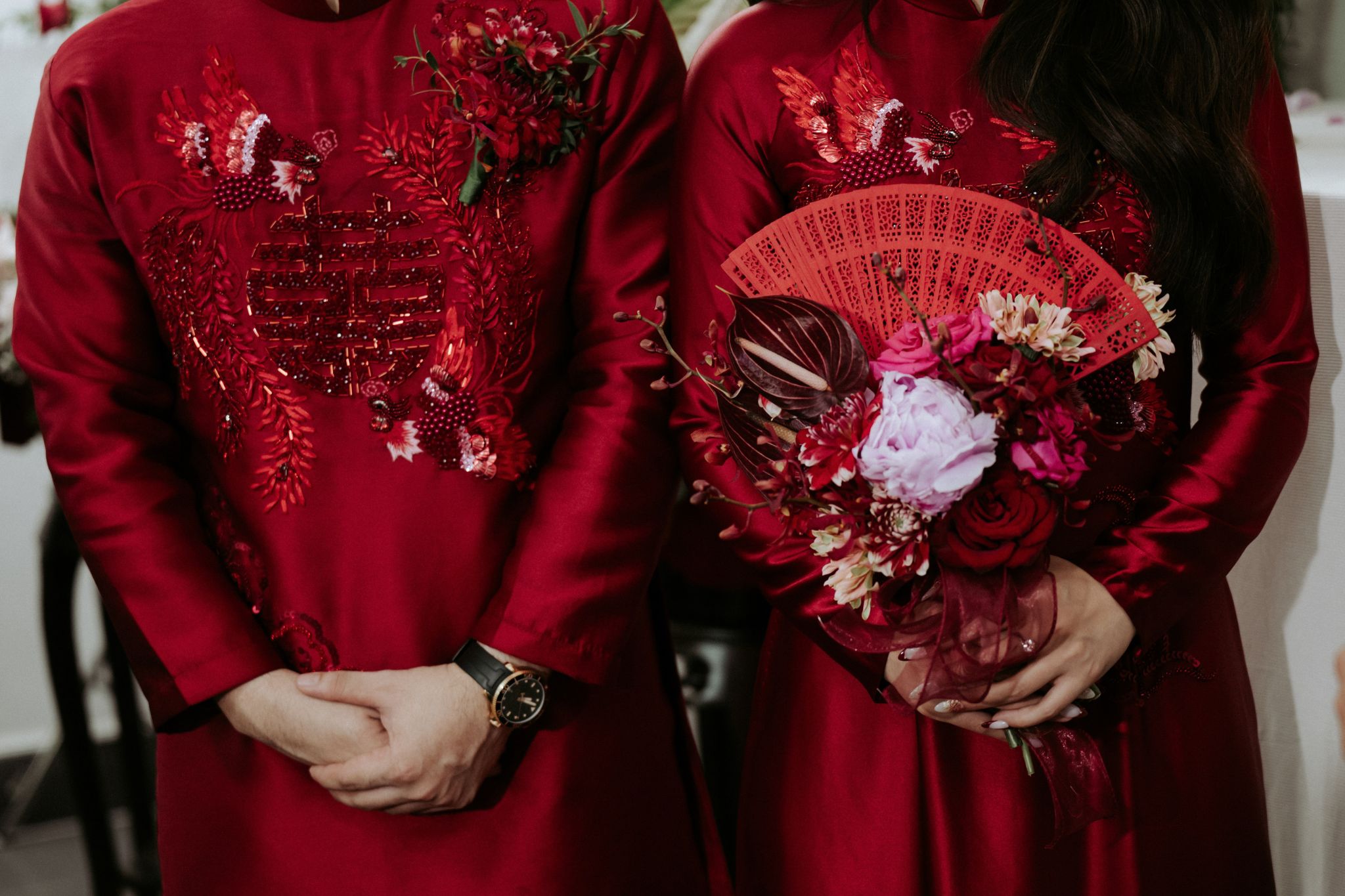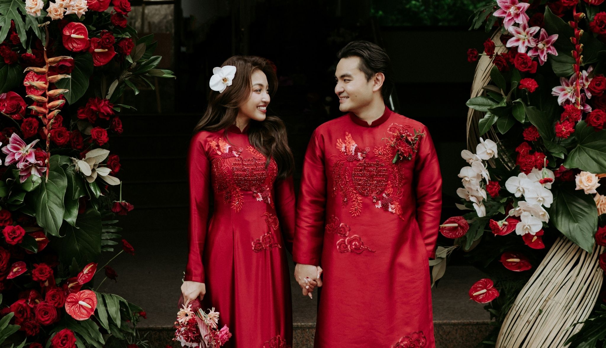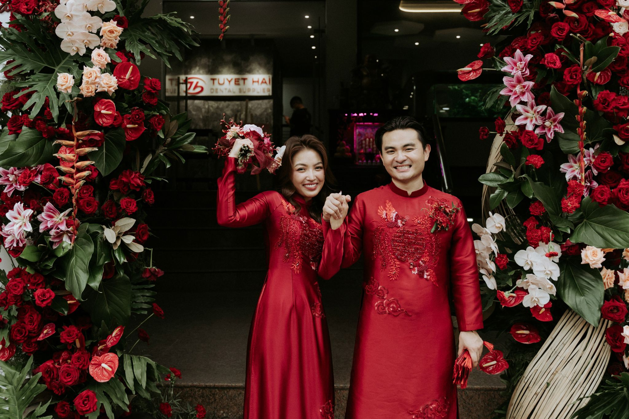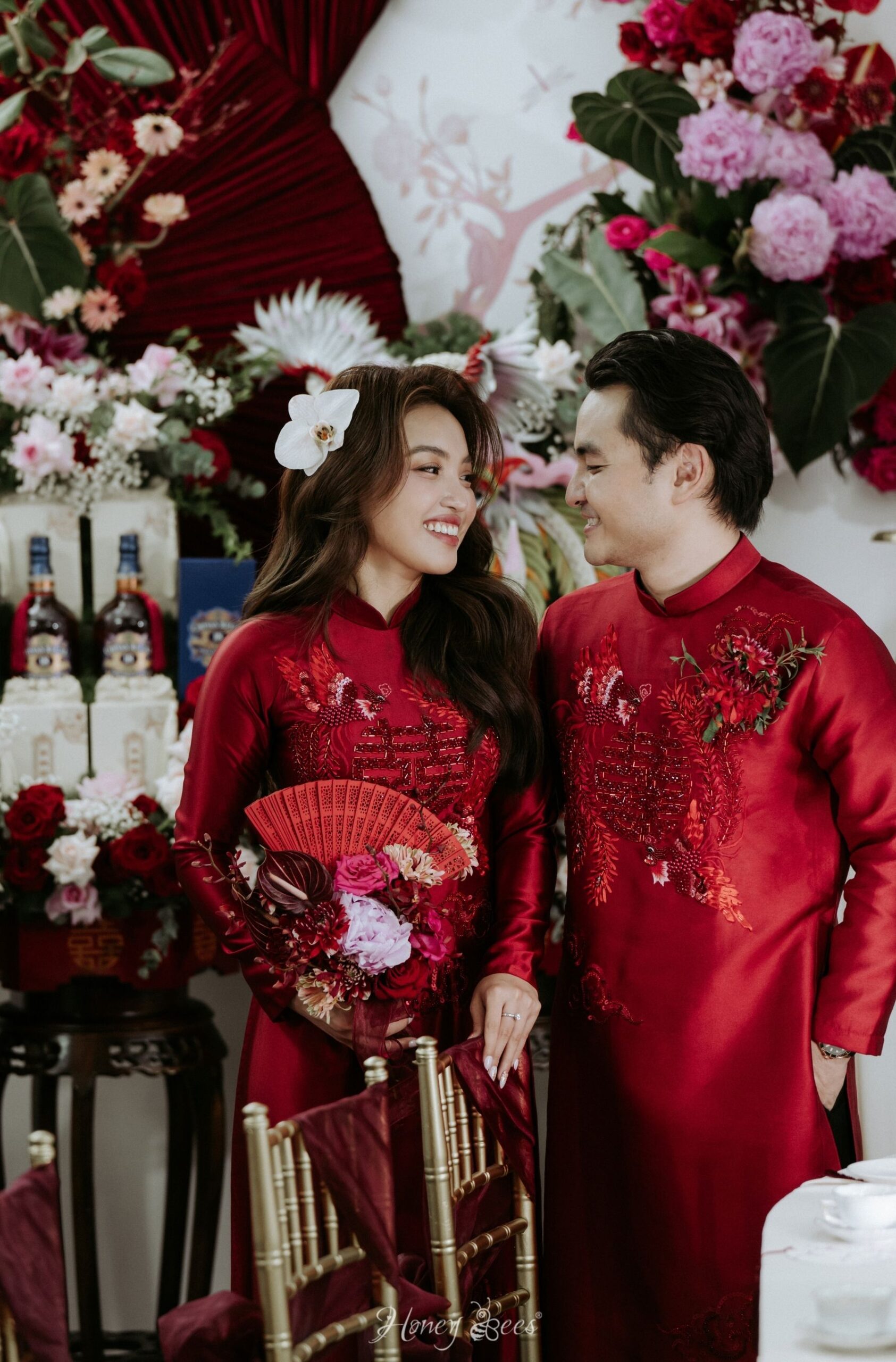 Concept đám cưới hỷ sắc “We Are One” là cách câu chuyện tình yêu của Khải và Tuyền được kể lại bằng ngôn ngữ của hương hoa và sắc màu. Sắc đỏ rượu vang – sâu, đằm và đầy nội lực – không chỉ đại diện cho hỷ sự theo quan niệm xưa, mà còn là biểu tượng của một tình yêu đã đủ mạnh mẽ để vượt qua những thử thách, đủ sâu sắc để thấu hiểu và đồng hành.Những chi tiết thủ công như cánh quạt vải, đèn lồng hay cách chữ Hỷ được cách tân không chỉ tạo điểm nhấn thị giác, mà còn là sự gợi nhắc về giá trị truyền thống – nơi mỗi đường nét đều mang theo ký ức văn hoá. Nhưng ẩn sau đó là một tinh thần rất hiện đại: cách phối màu táo bạo, bố cục không gian có chiều sâu và sự tự do trong cách thể hiện cảm xúc.Không gian ấy vì thế trở thành nơi giao thoa giữa hai thế giới – một bên là nét đẹp xưa cũ, một bên là hơi thở đương đại. Và ở trung tâm của tất cả, chính là hai con người đang dần hoà làm một. Từng ánh nhìn, cái nắm tay hay giọt nước mắt xúc động đều trở nên rõ nét hơn trong nền đỏ ấm áp ấy, như thể mọi cảm xúc đều được nâng đỡ và tôn vinh. “We Are One” vì thế không chỉ là một buổi lễ, mà là khoảnh khắc hai cuộc đời chính thức gọi tên nhau trong sự chứng kiến của những điều thiêng liêng nhất.