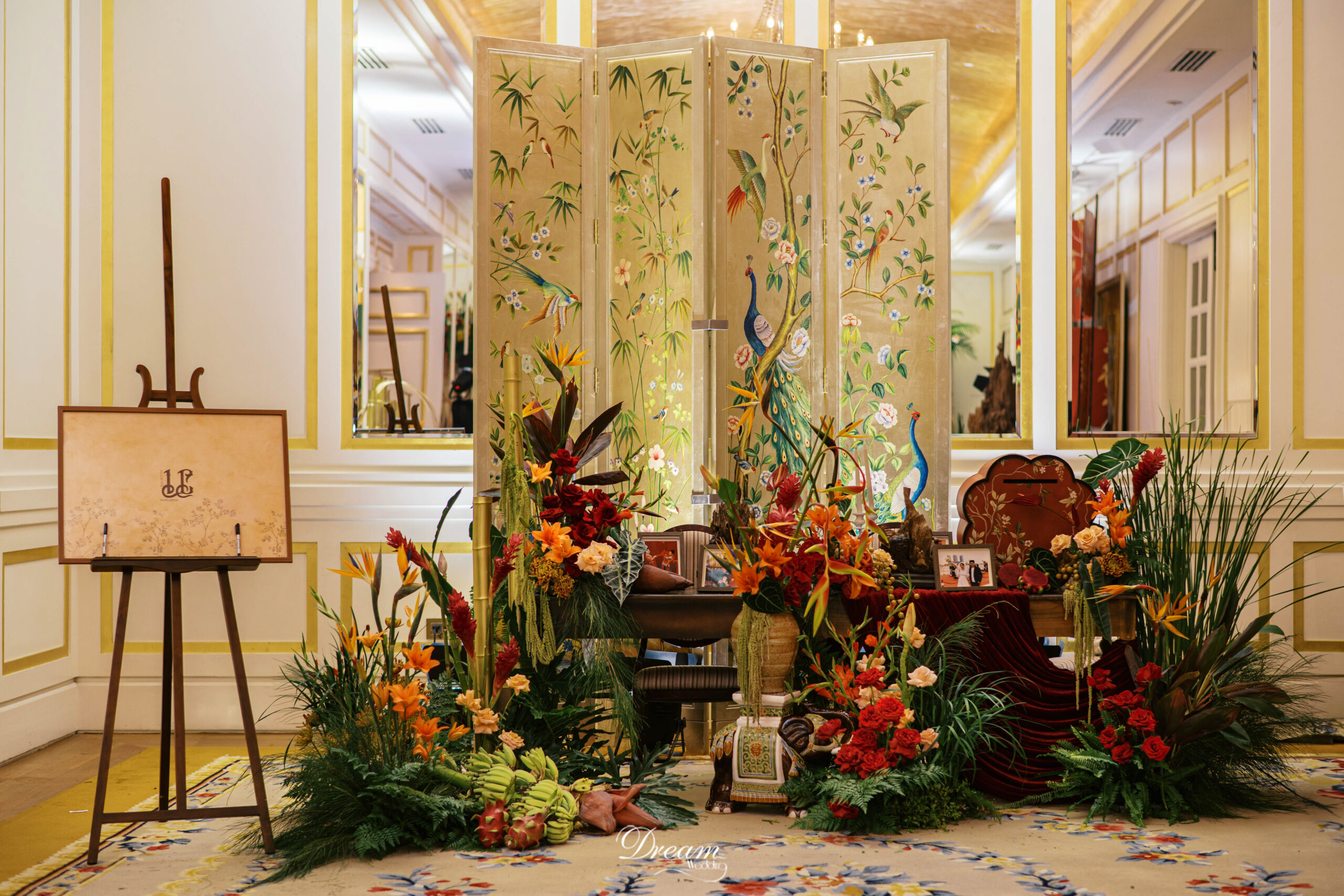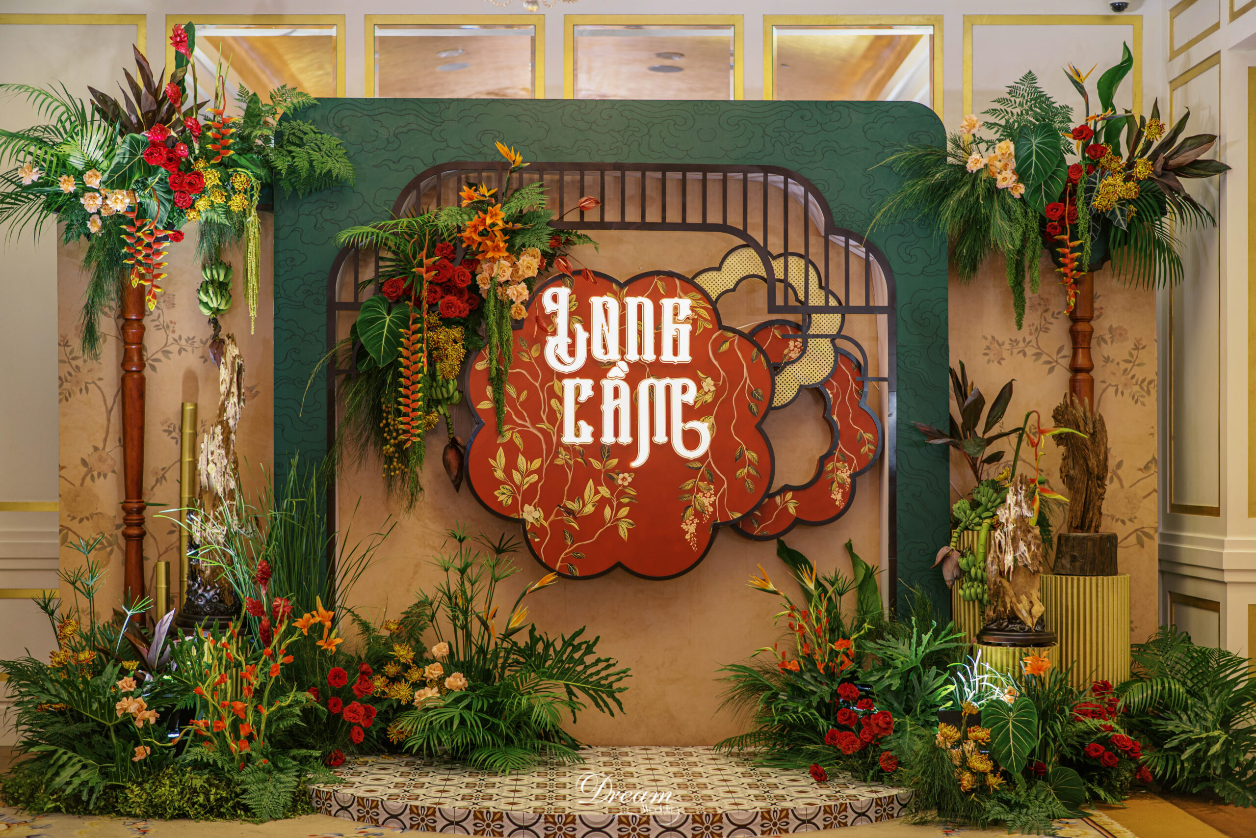 Hoa và hương – linh hồn của buổi tiệc: Hoa lan hồ điệp, hoa hồng và hoa mào gà tượng trưng cho phú quý, tình yêu và sự viên mãn. Cùng với đó là hương trầm tự nhiên, loại gỗ quý được xem là biểu tượng của may mắn và thịnh vượng, tạo nên cảm giác an lành và thiêng liêng cho nghi lễ thành hôn.