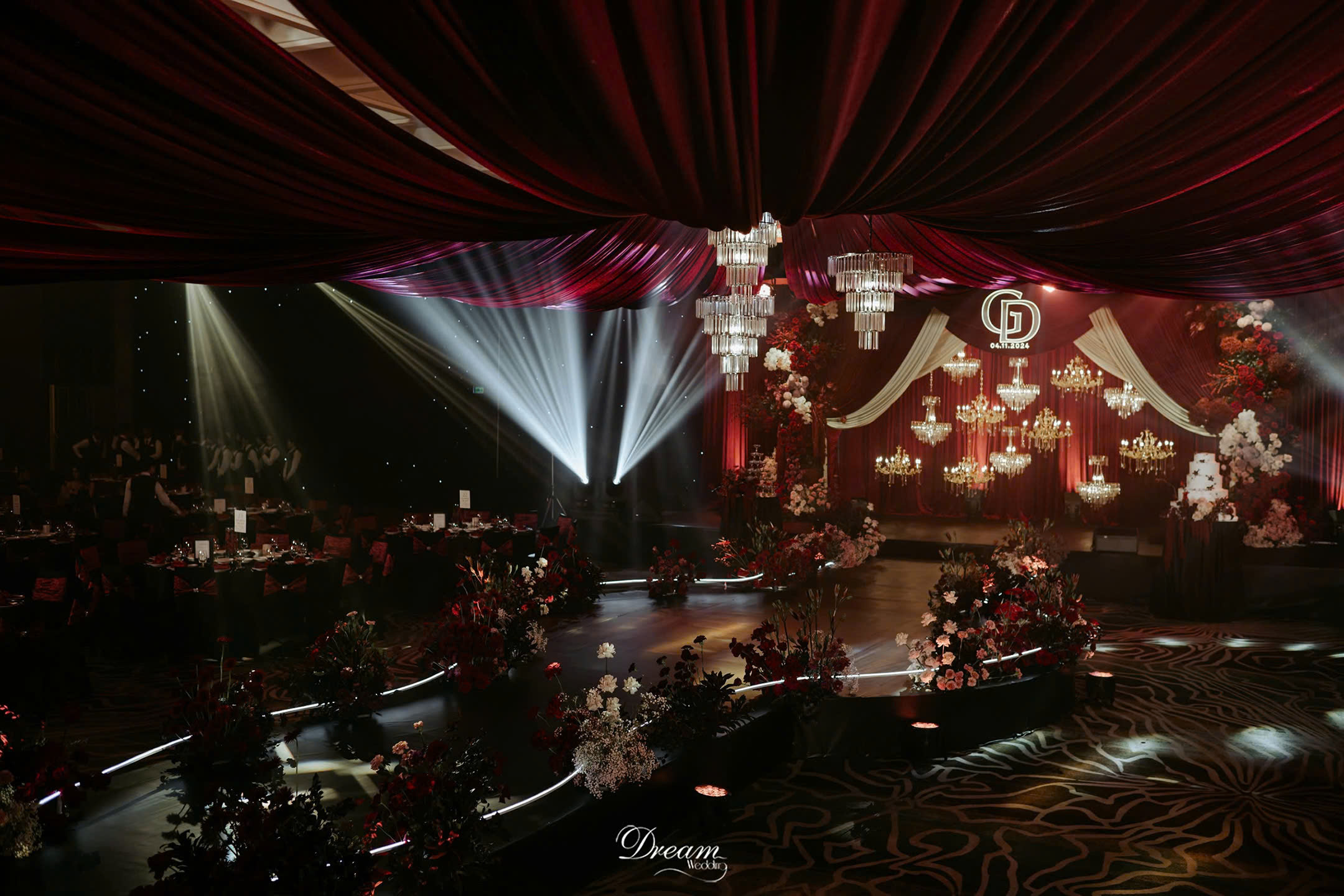 Không gian tiệc cưới được khoác lên màu đỏ huyền bí – gam màu tượng trưng cho tình yêu nồng cháy và sự viên mãn. Ánh sáng lung linh hòa cùng tiếng nhạc du dương đã biến nơi đây thành một khung cảnh như trong mơ. Mỗi cánh hoa, mỗi chi tiết trang trí đều mang theo lời nhắn gửi về sự may mắn, sung túc và vĩnh cửu.