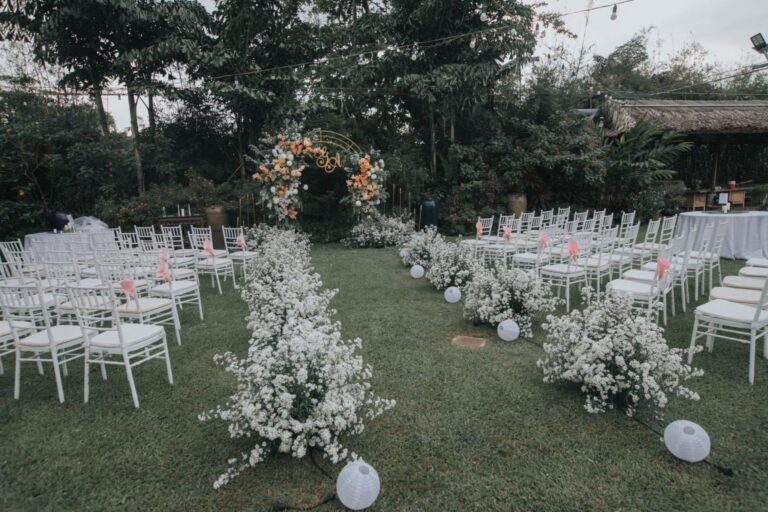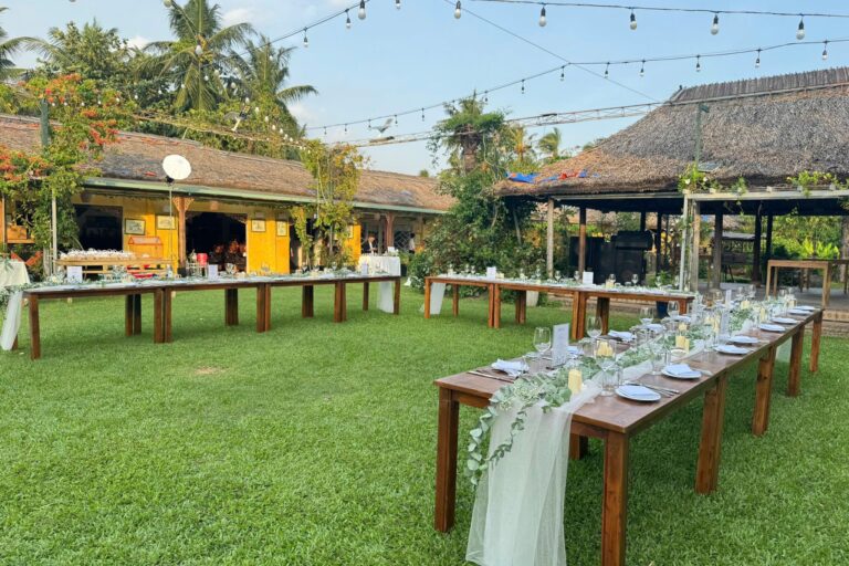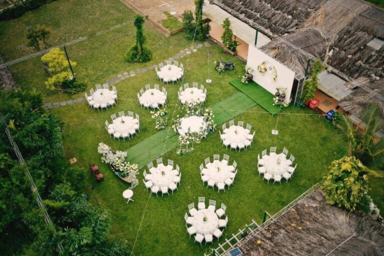 Bình An Village không chỉ là khu nghỉ dưỡng mà còn là địa điểm tổ chức tiệc cưới và sự kiện ngoài trời đầy lãng mạn, bao quanh bởi vườn cây xanh và mặt hồ phẳng lặng. Mỗi bữa tiệc tại đây đều được chăm chút tỉ mỉ, mang đến trải nghiệm gần gũi mà sang trọng.